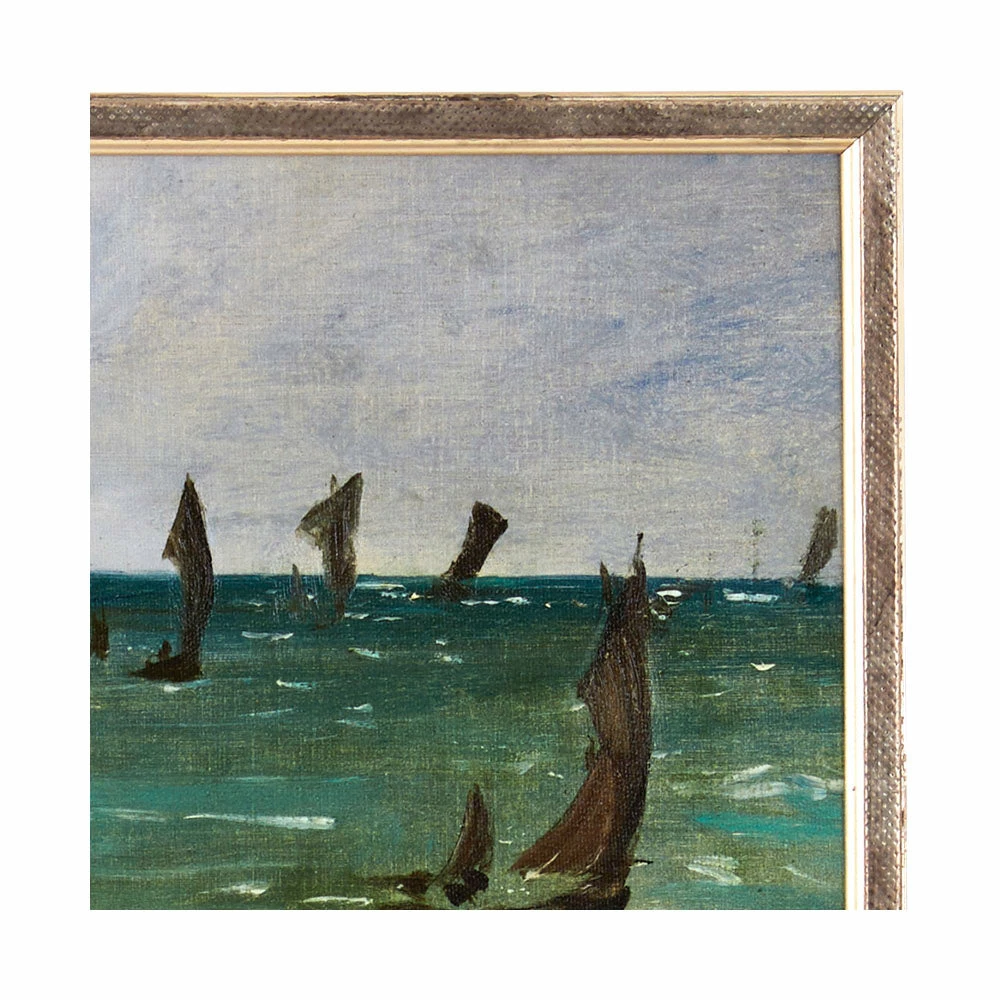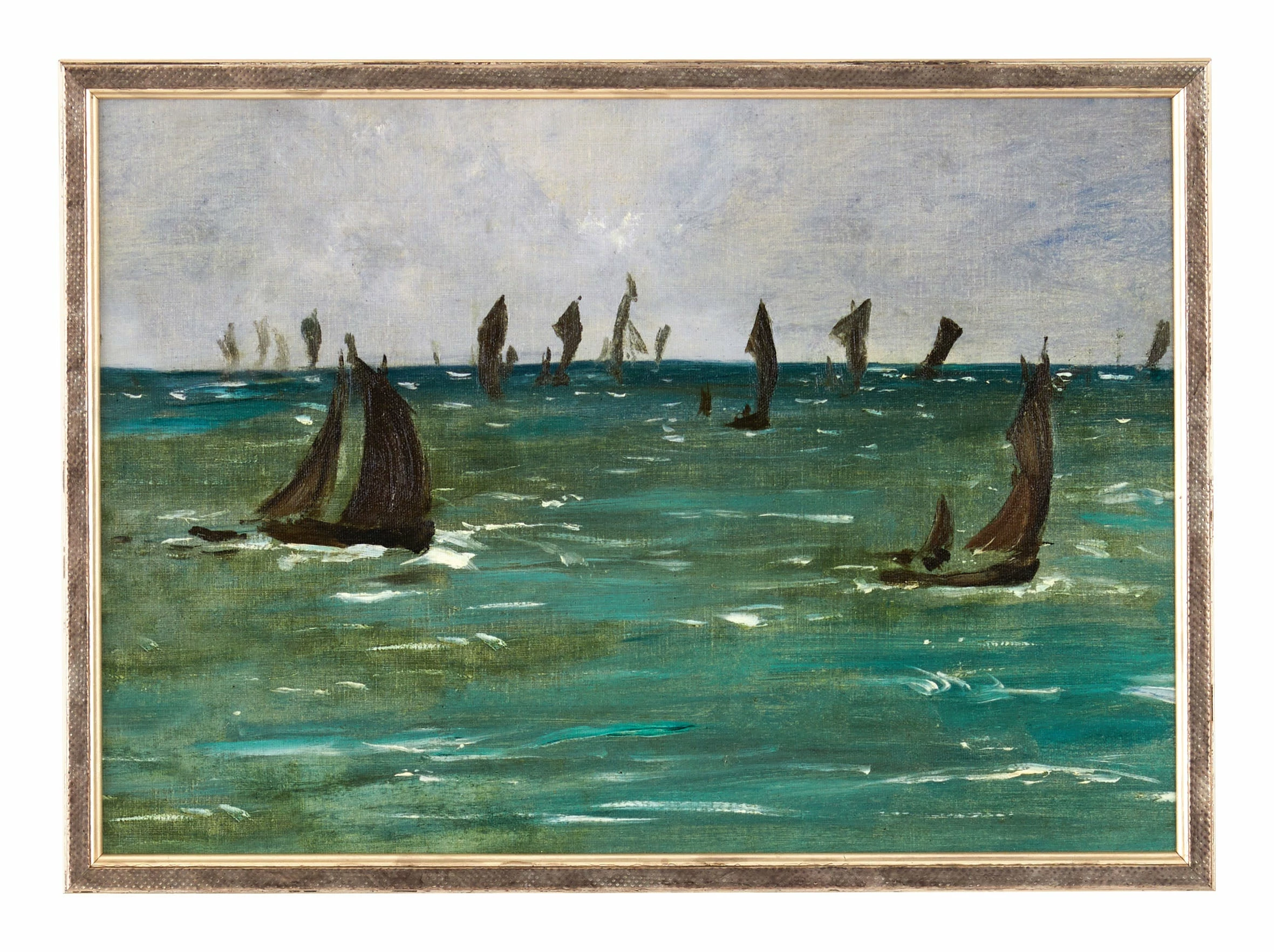 Add a nautical feel to your art collection with our Anchorage Print. Filled with frenzied movement, this piece captures a fleet of sailboats in choppy waters using thick, energetic brushstrokes and deep shades of teal, blue and green with touches of white. While it may be a reproduction of an original work, it has been printed on canvas artist board and finished with hand-applied details for a one-of-a-kind feel. We’ve displayed it without glass in an antiqued brass frame, which adds to its timeworn appeal while also lending a subtle hint of shine. Great hung solo, our Anchorage Print also mixes in nicely with other vintage-inspired works for a gallery wall with a sense of history.Â