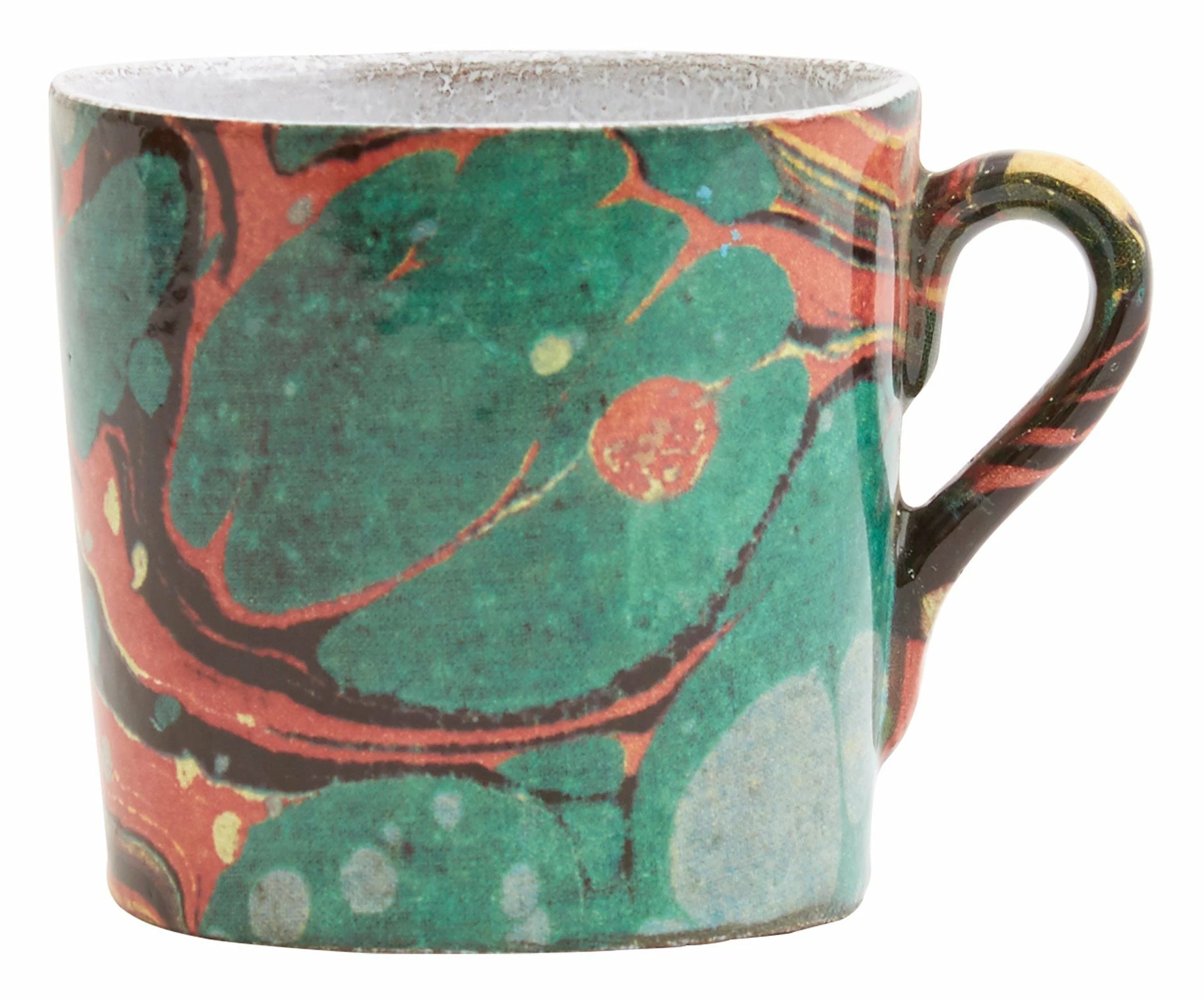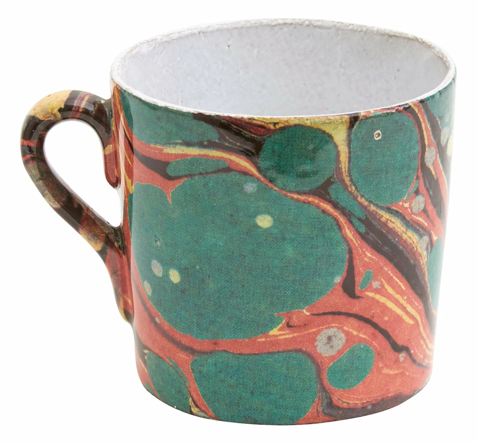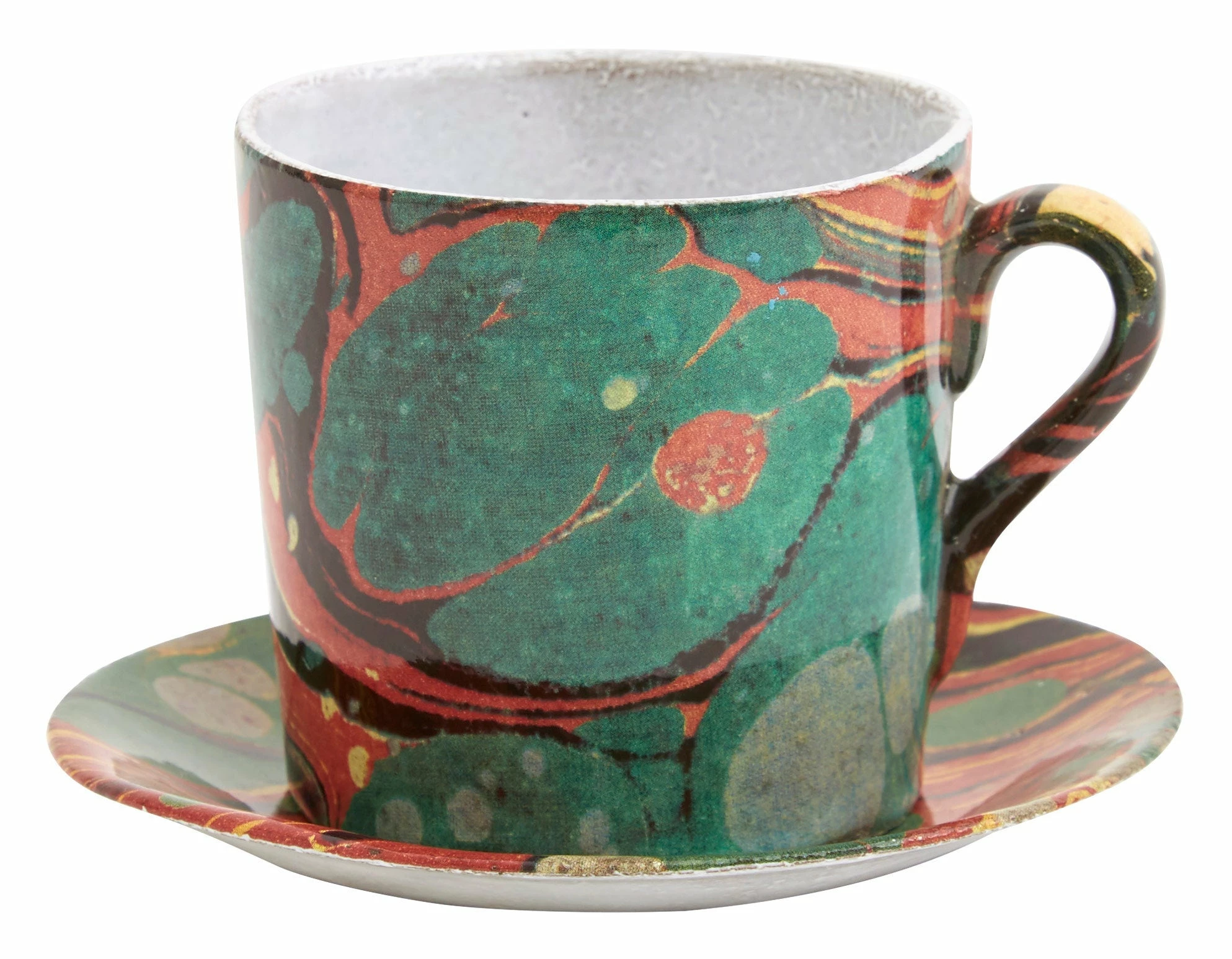 Pairing a 19th century-inspired pottery design with a swirling marbleized motif, the Marbled Cup and Saucer will add a layer of antique interest to any table setting. These delicate dishes come to us from renowned ceramicist Astier de Villatte’s Paris workshop, housed in what was once the atelier of Napoleon’s own silversmith. There, this piece was handcrafted from black terracotta following old school methods passed down for generations. Rather than the brand’s signature milky white glaze, however these pieces are patterned with a reproduction of a multi-colored vintage marbled endpaper, taken from celebrated designer John Derian’s expansive collection of antique images. Perfectly imperfect, they’re great on their own but even better as a set. We especially love them paired with the wonderfully unique Marbled Teapot.