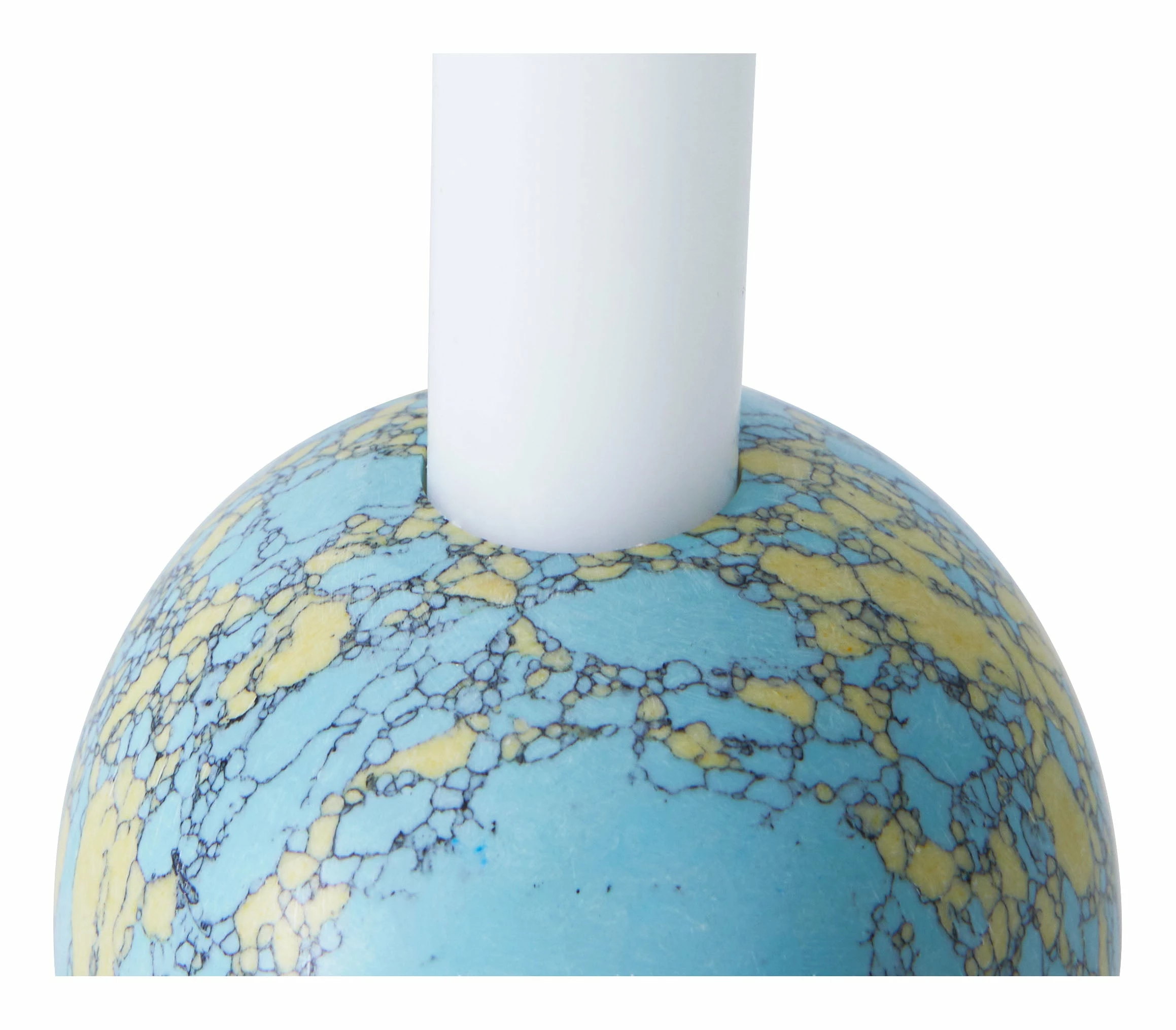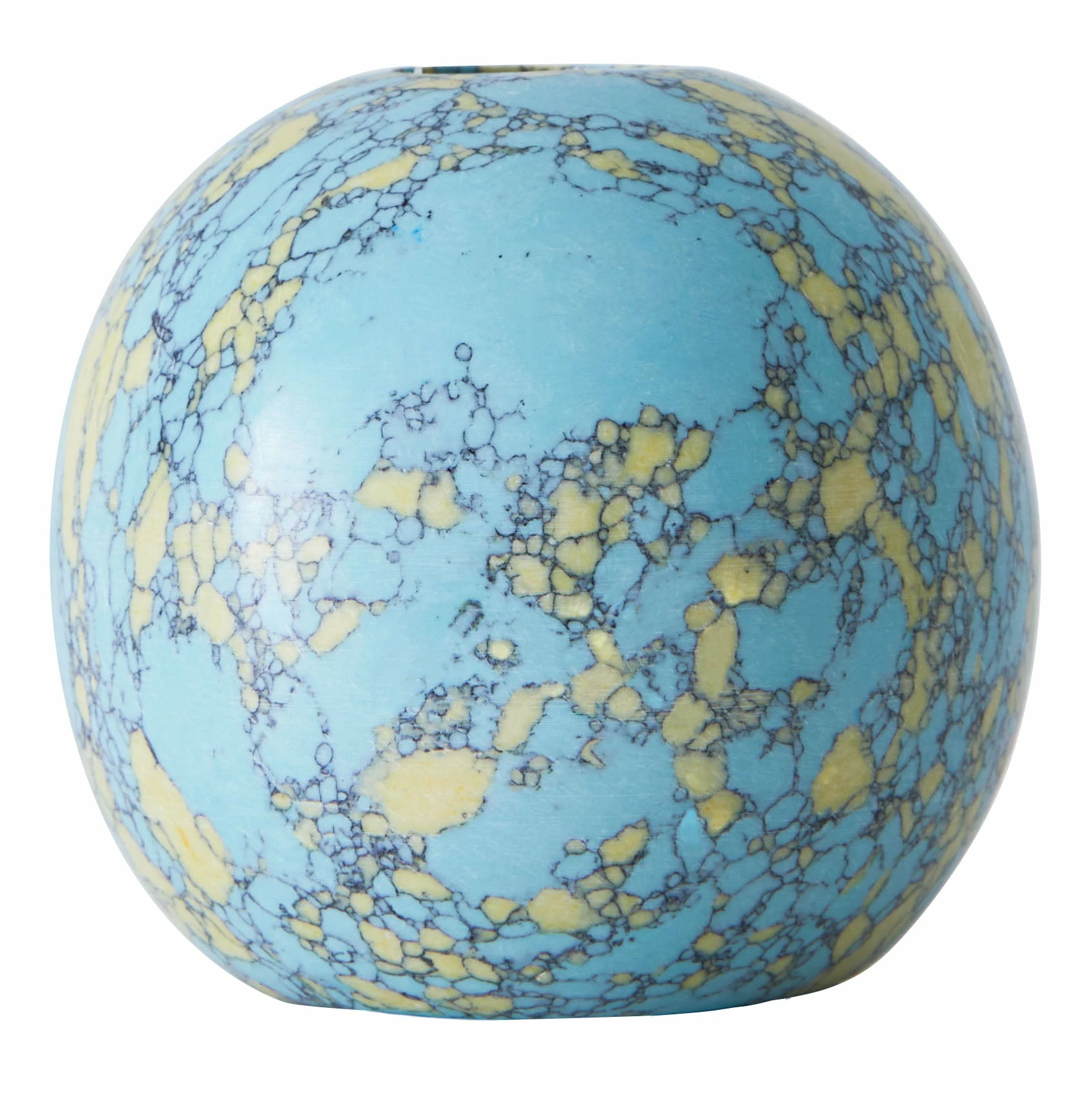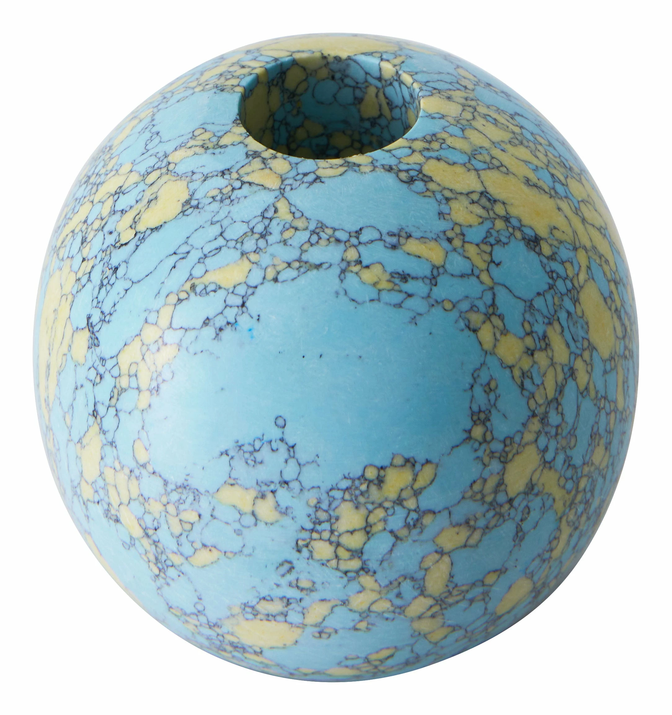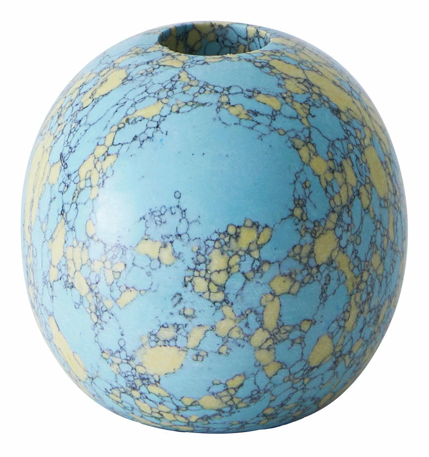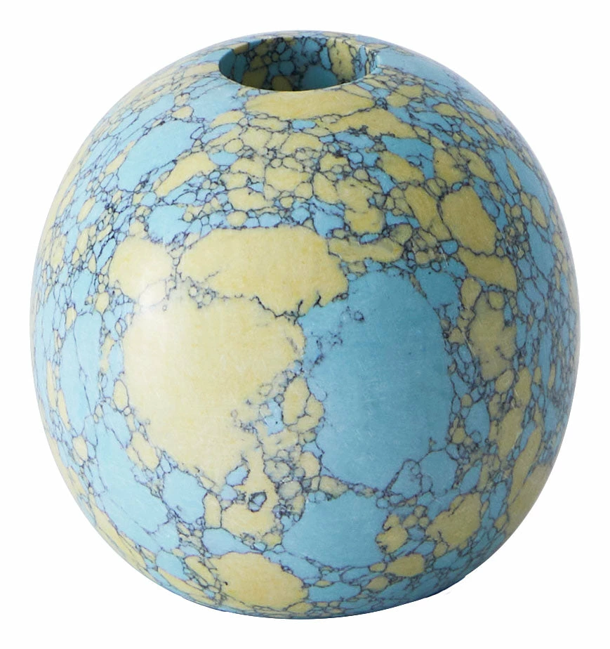 Add a unique pop of color and character to any tabletop vignette with our Bijou Candle Holder. This little beauty is crafted from resin and crushed stone in a fresh turquoise and yellow palette, which has been formed into a simple, spherical shape. Perfectly sized to hold a standard taper holder, it’s great for adding a bright spot to a side table or mantel or as a pair on a funky, modern dining table.
