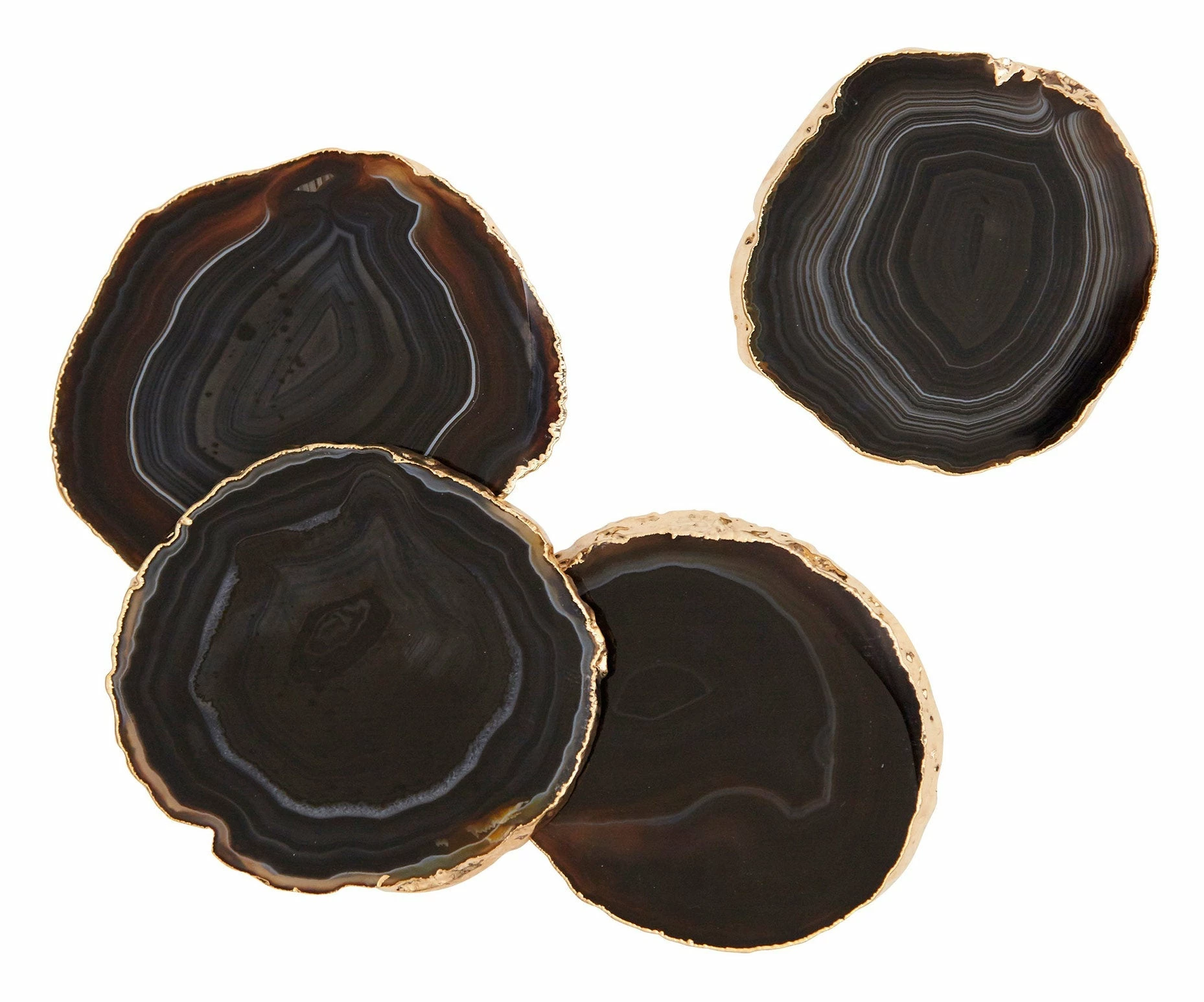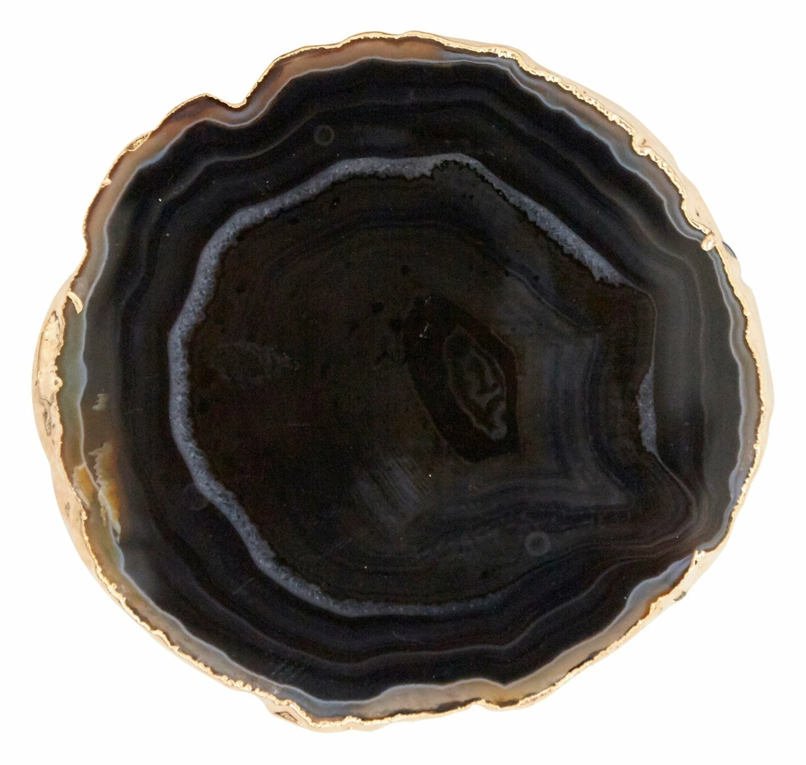 Geodes have gone glam with our gorgeous Black & Gold Coasters. These stunning drink rests are sliced from semi-precious black agate stones, formed from ancient volcanic lava. Each one is polished to a smooth finish, enhancing its unique ring-like striations and swirled hints of white, grey and shades of brown. For a touch of contrasting shine, their textured, rocky edges are finished with metallic gold paint. Perfectly sized for a mug or cocktail glass, we think they’re pretty enough to leave out on the coffee table or bar even when you’re not putting them to use. With organic shapes and hues formed by the earth itself, each of our Black & Gold Coasters is unique in shape and size.