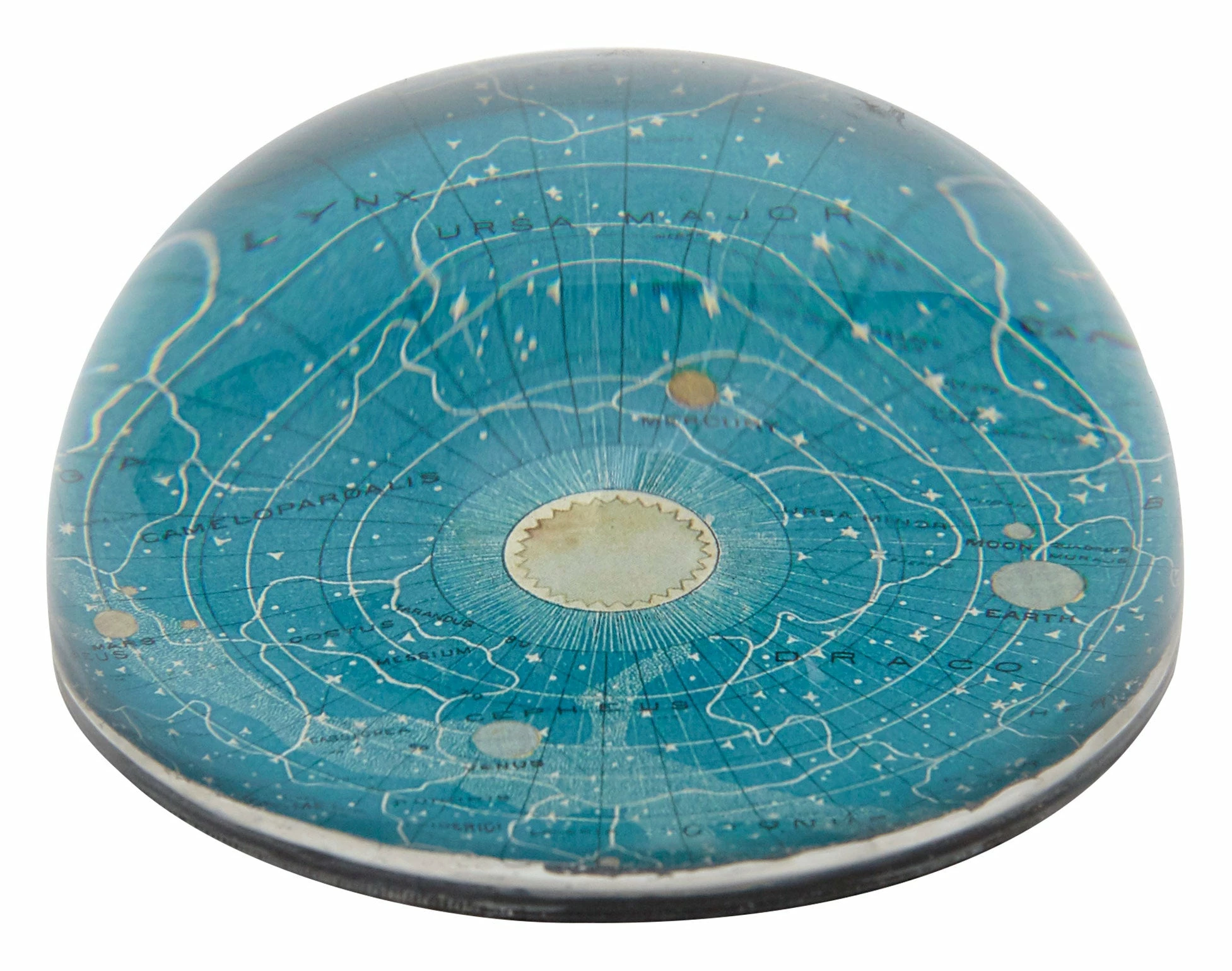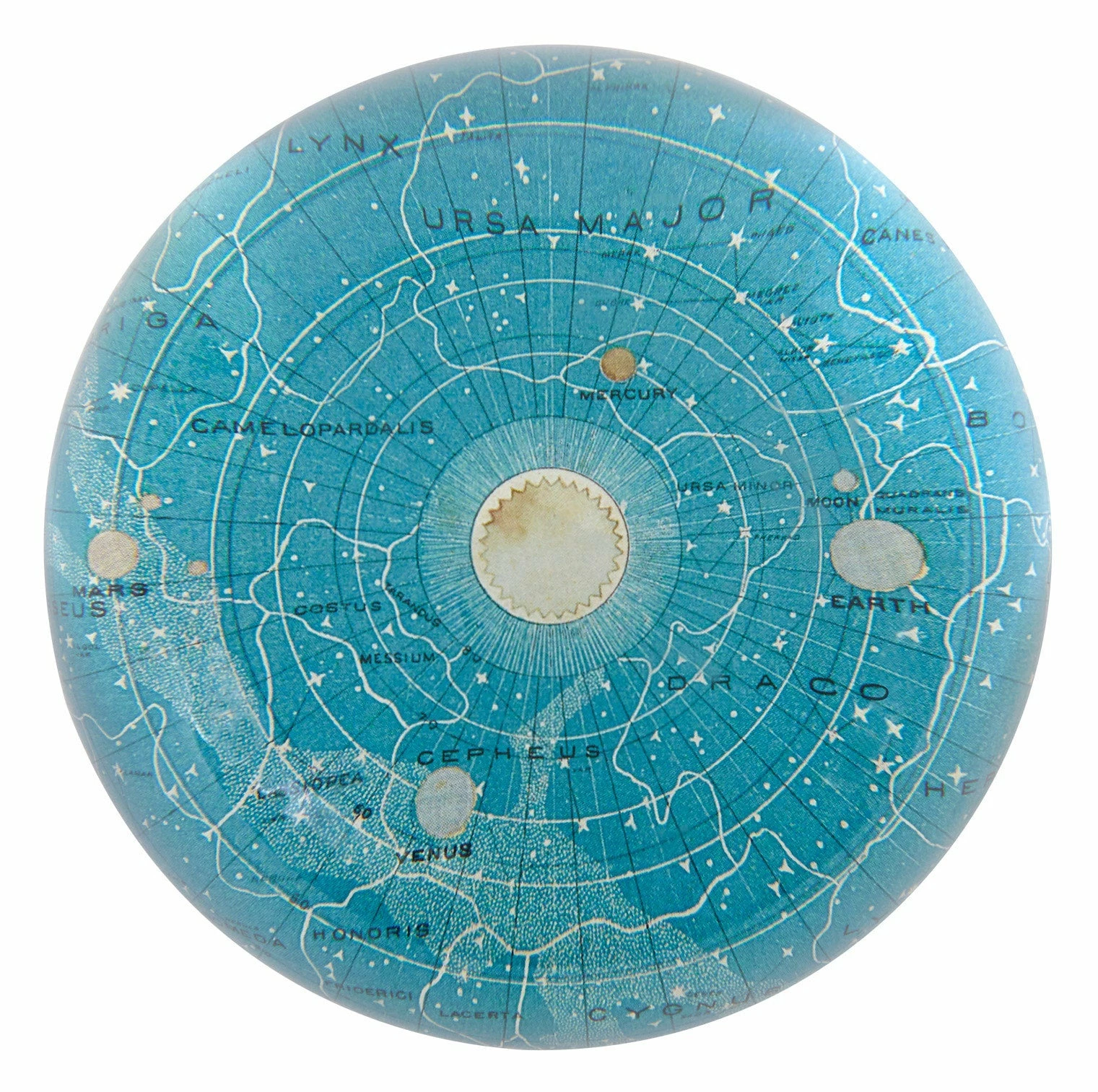 Unleash your inner astrologer with the Blue Universe Paperweight. This dreamy accessory features a vintage hand drawn chart of our solar system, with the sun at its center and key planets, stars and constellations neatly labeled. Taken from celebrated designer John Derian’s expansive collection of antique images, this stylized vintage illustration was reproduced under handblown glass to create this stellar desktop essential. Perfect for any workspace, it’s a must-have for anyone with an eye towards the sky.