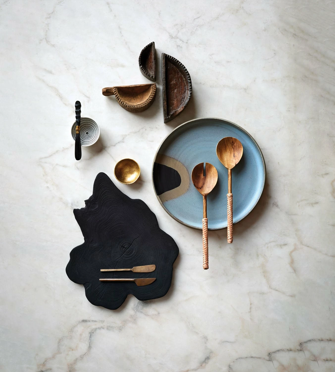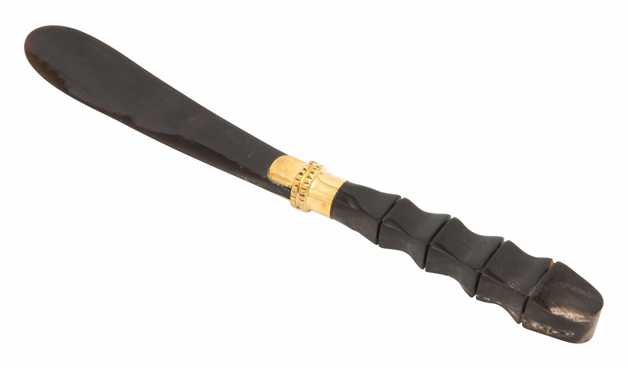 Our Carved Black Horn Spreader makes a handsome addition to any rustic tabletop. Both the blade and handle of this organic utensil are crafted from polished black horn, with a shiny brass detail connecting the two. Use this natural piece of cutlery at your next dinner party for serving soft cheeses and dips or spreading butter. Paired with one of our serve boards, our Carved Black Horn Spreader would also make a thoughtful hostess or housewarming gift.