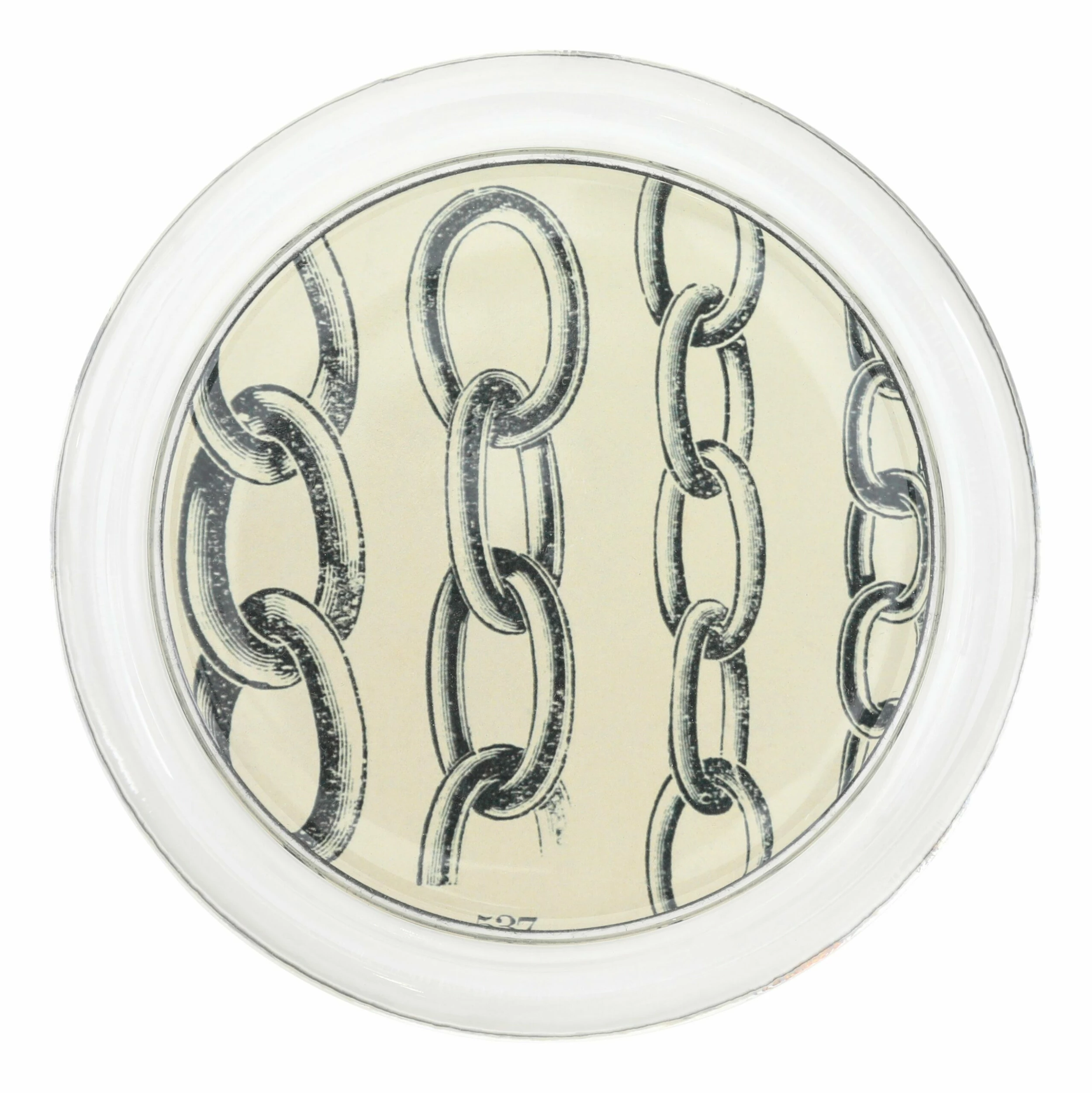 Leave it to celebrated designer John Derian to find a pleasing pattern in something as ordinary as chains. Our Circle Chain Coaster features a curious vintage illustration of four chain links in black-and-white. Sourced from John Derian’s extensive collection of antique drawings and calligraphy, this image has been reimagined under handblown glass to create a charming decoupaged coaster. Perfect as a catchall tray for odds and ends as a single, we also love it in multiples for keeping the coffee table safe from the dreaded drink rings.