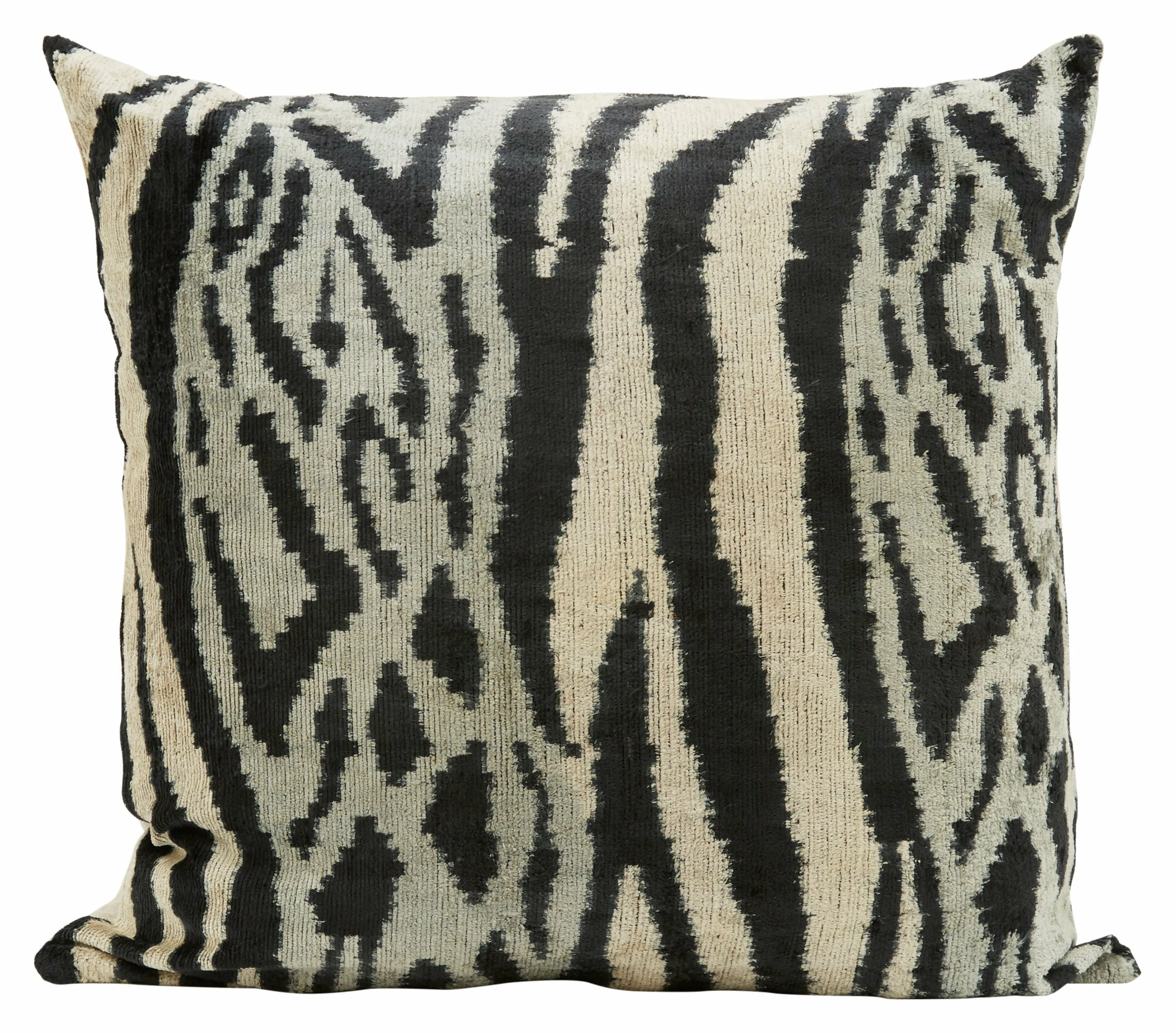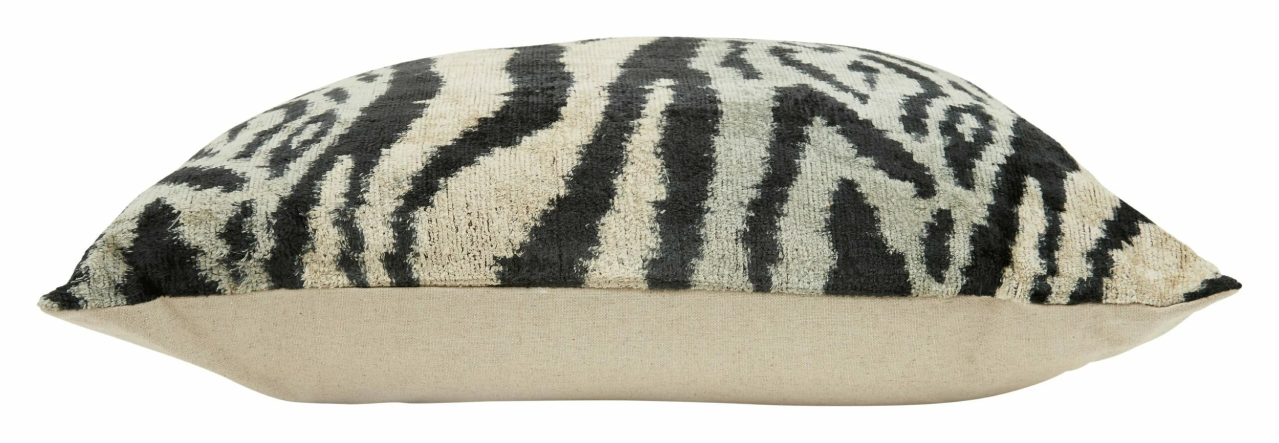 Bring global-chic vibes to your sofa or bed with our Cole Pillow. Made from super-soft silk velvet, Cole is crafted using traditional ikat techniques — a centuries-old resist-dyeing process that originated in Central Asia. In this method, threads are wrapped around a frame and individually tied off with pigment-resistant palm fibers before dyeing and weaving. With each dye color, fibers are added or removed to create colorful and uniquely intricate motifs. Bold and sophisticated, Cole features an animal print-inspired pattern in black, cream and hints of icy light blue. We’ve finished it with neutral linen backing, a hidden zipper closure and a plush down and feather insert. Perfect as a layer in modern and boho spaces alike, we love Cole on its own or mixed in with other pillows in a similar palette.