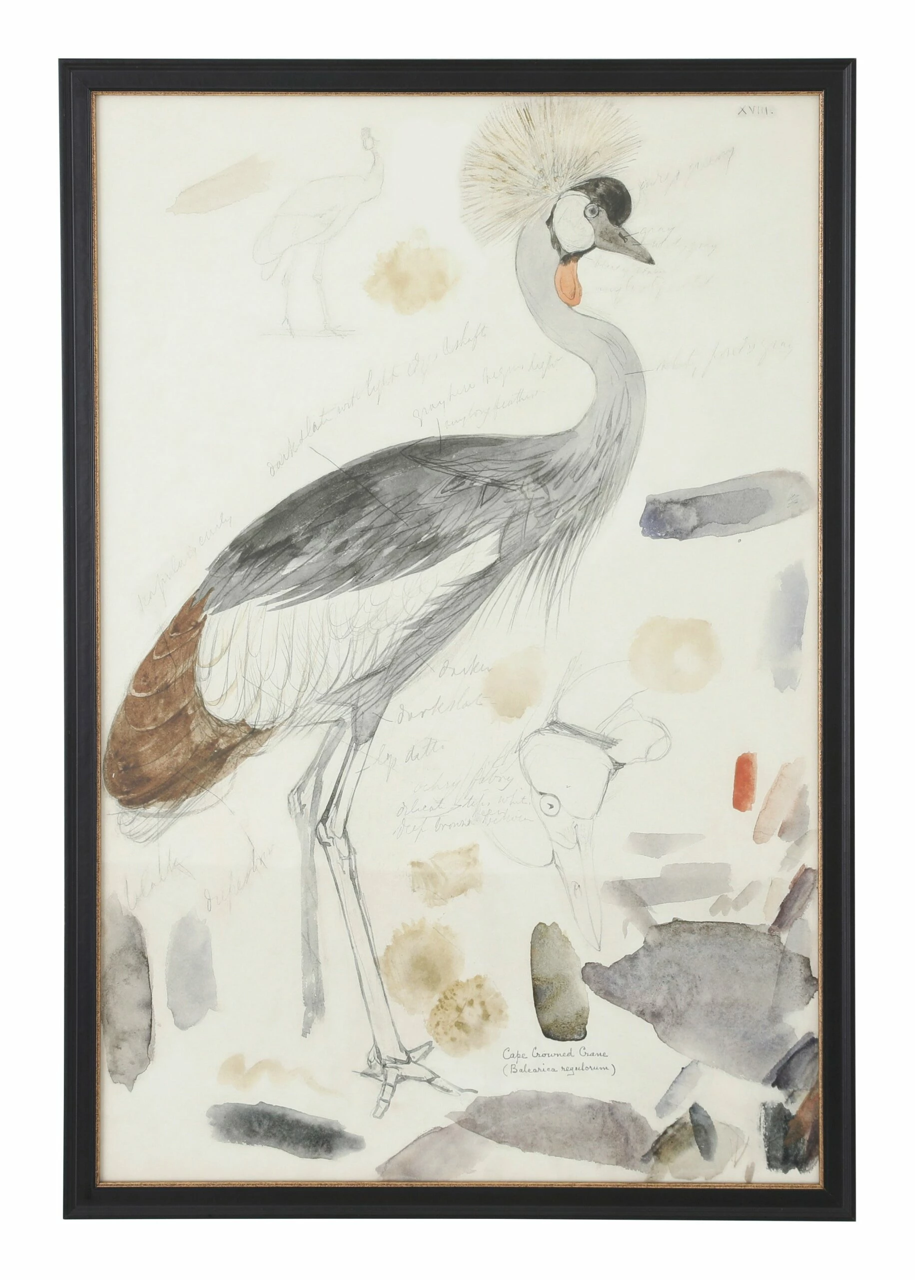We all know Edward Lear for his delightfully nonsensical verses, but few remember that the 19th-century poet and limericist also had a short career as an ornithological illustrator in his teenage years. Using the live birds housed at London’s Zoological Gardens as models, the young artist created beautiful ink, graphite and watercolor sketches of countless exotic species. Our Crane Print II is a stunning facsimile of one of his sketchbook pages, depicting an elegant species commonly known as the African crowned crane. This naturalistic illustration is surrounded by the artist’s hand-written notations, loose sketches and color samples, which together give it all the feel of a true one-of-a-kind original. We’ve stuck with its vintage vibe and finished it in a classic black frame with a gilded interior edge for just a hint of shine. Perfect for bringing a bit of history to any space, we especially love this piece hung alongside our Crane Print I or mixed in with other antique-inspired works for an art wall with a classic, collected feel.