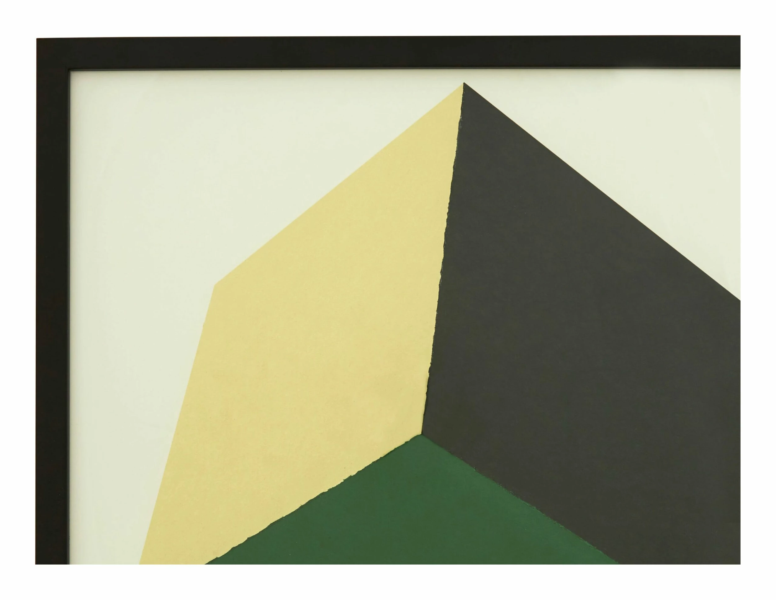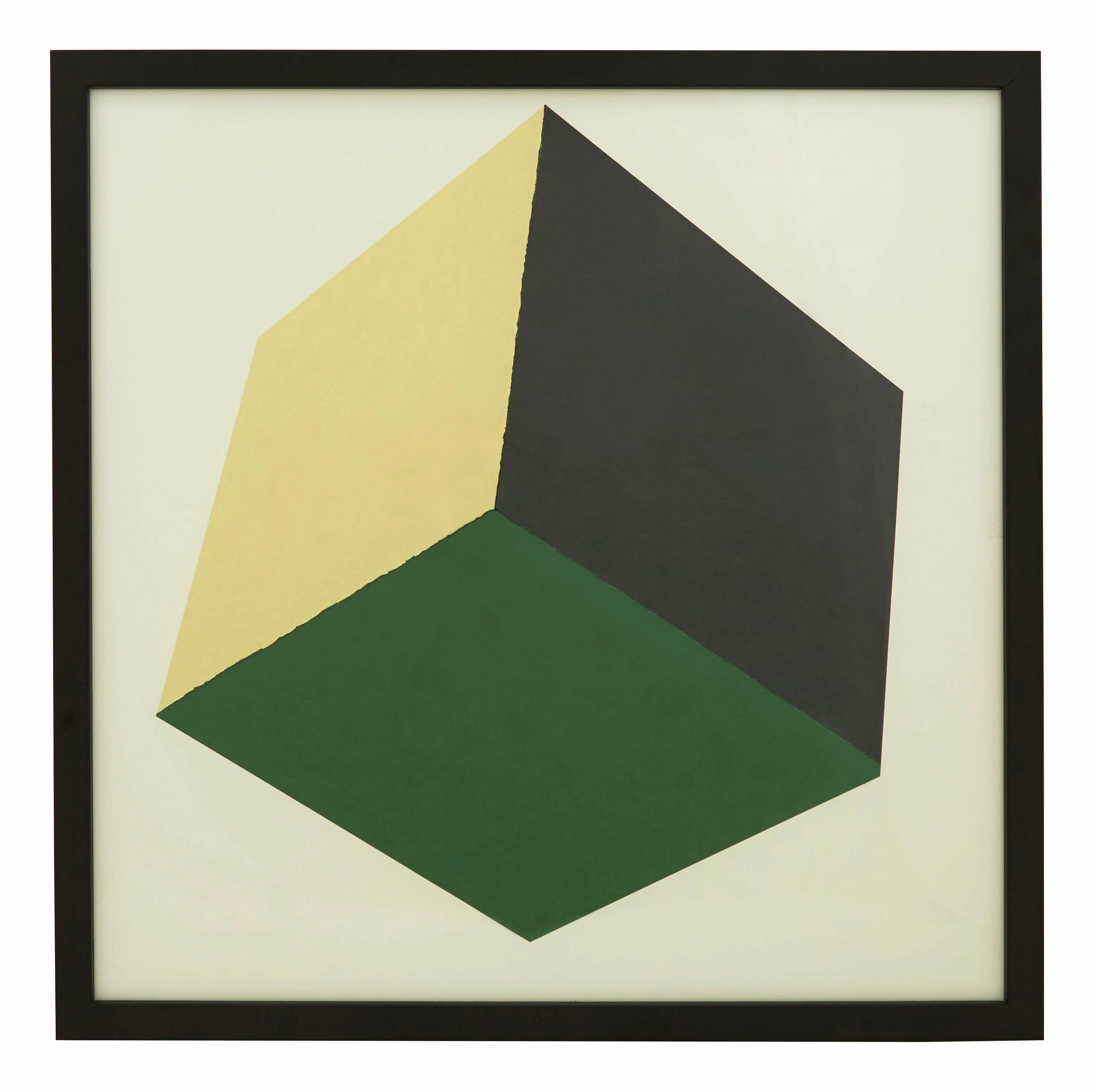 Wake up your walls with our geometric Cube Study I. Inspired in composition by an original mid-century era design, this striking giclée print features a simple cube in green, pale yellow and black, floated on a contrasting cream-colored ground. A clean-lined black frame makes the perfect finishing touch without pulling focus from the piece itself. An instant favorite in any art collection, we love it hung on its own or grouped with any (or all) of our other Cube Studies for a chic, modern installation.
