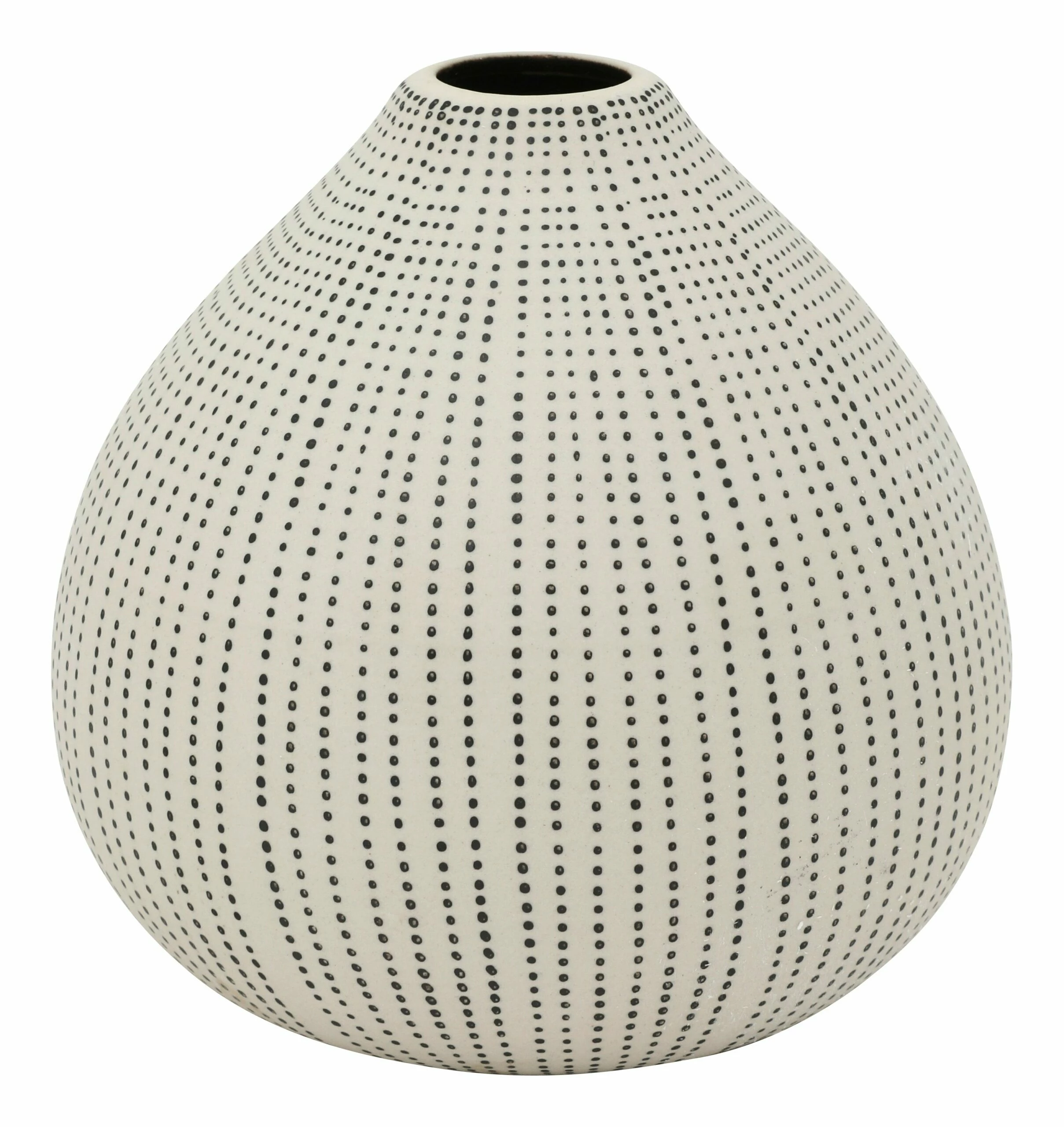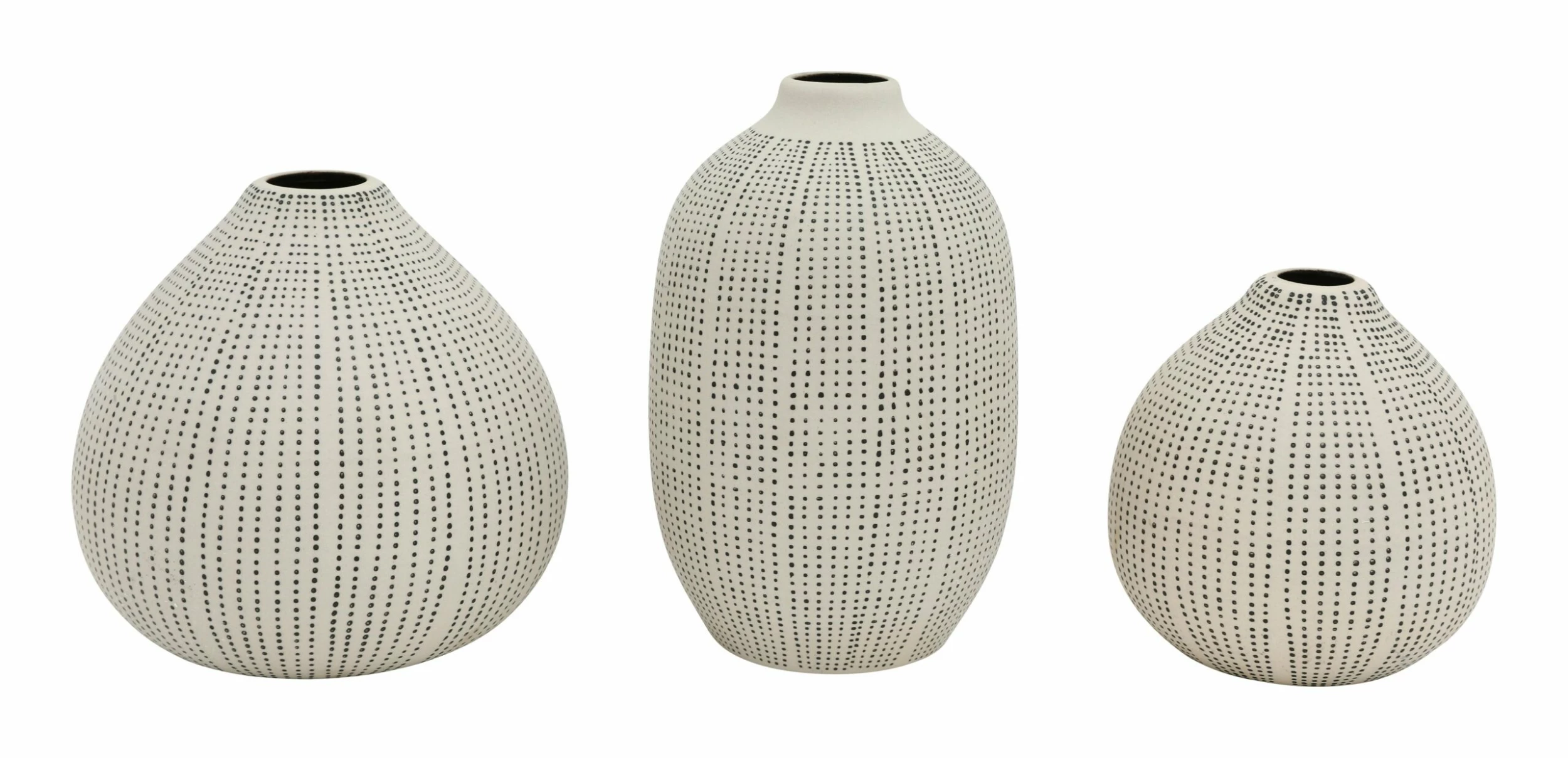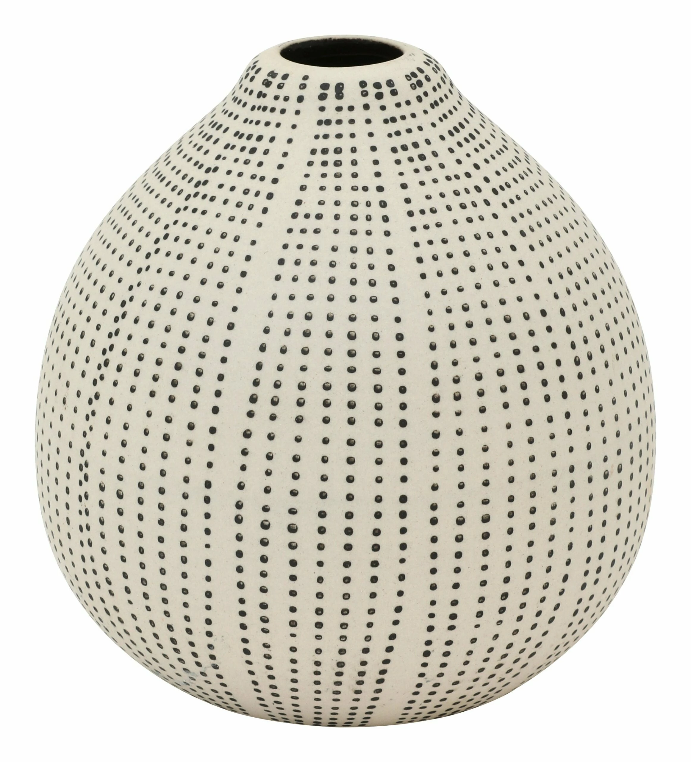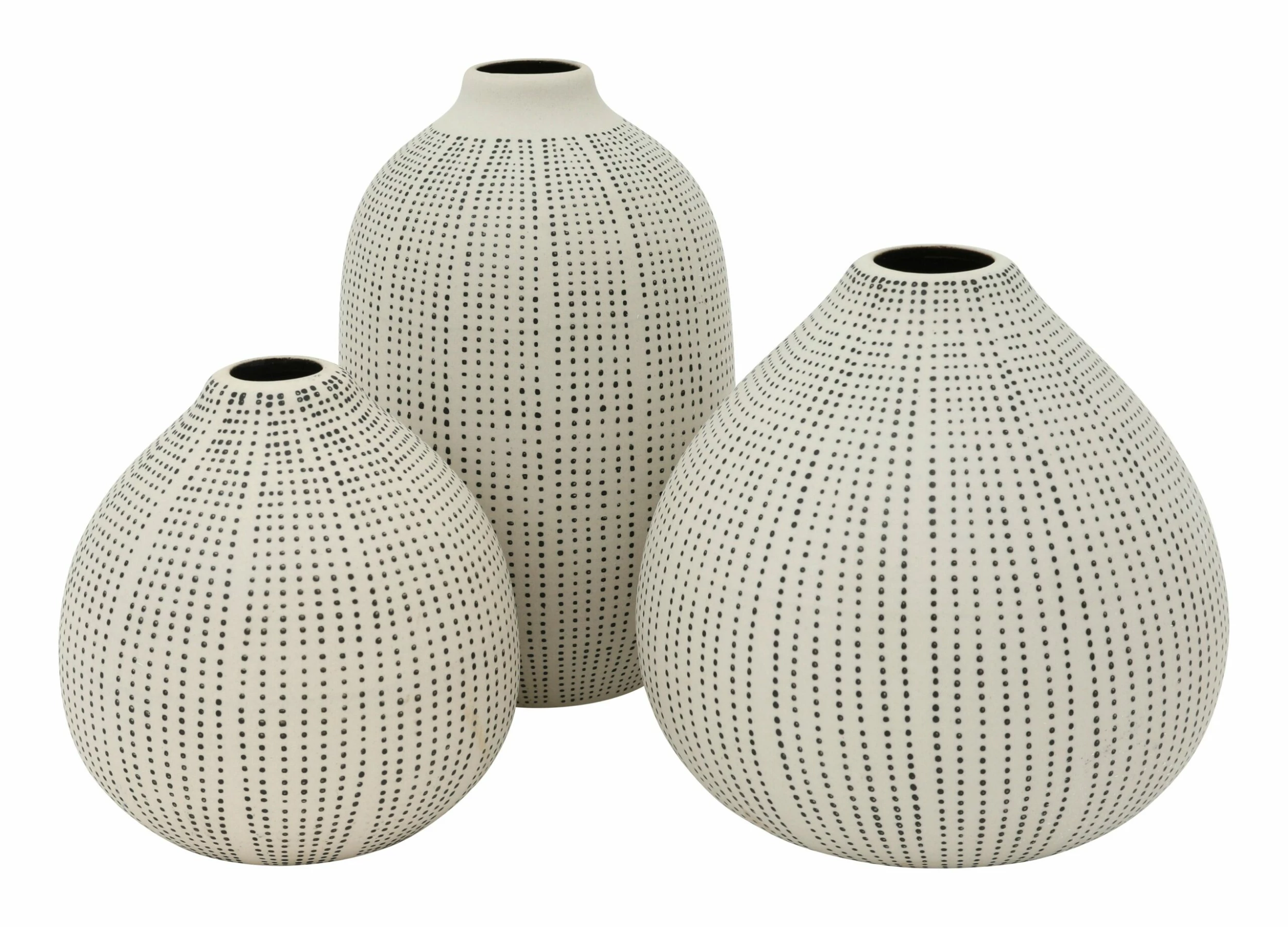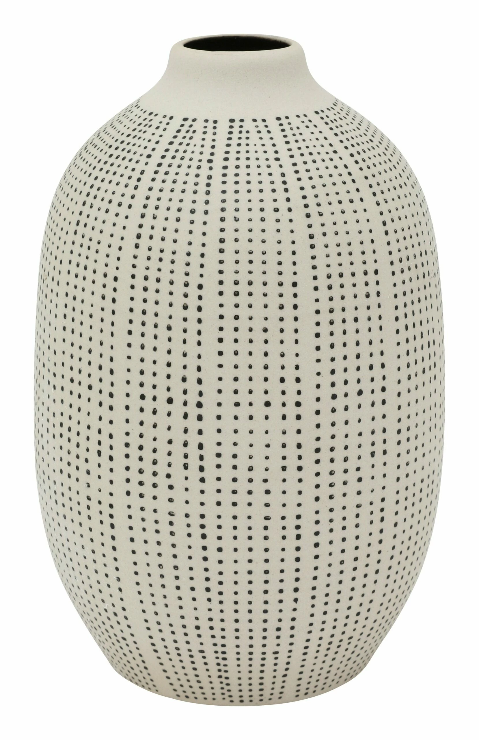 Turn a few loose stems into a unique arrangement with our Deirdre Vases. Crafted from stoneware into simple, organic shapes, these vessels are covered with a textural matte cream glaze and patterned with neat rows of minuscule black dots. Great as a single mixed into an earthy tabletop vignette, we also love a trio of all three sizes clustered together and filled with florals.
