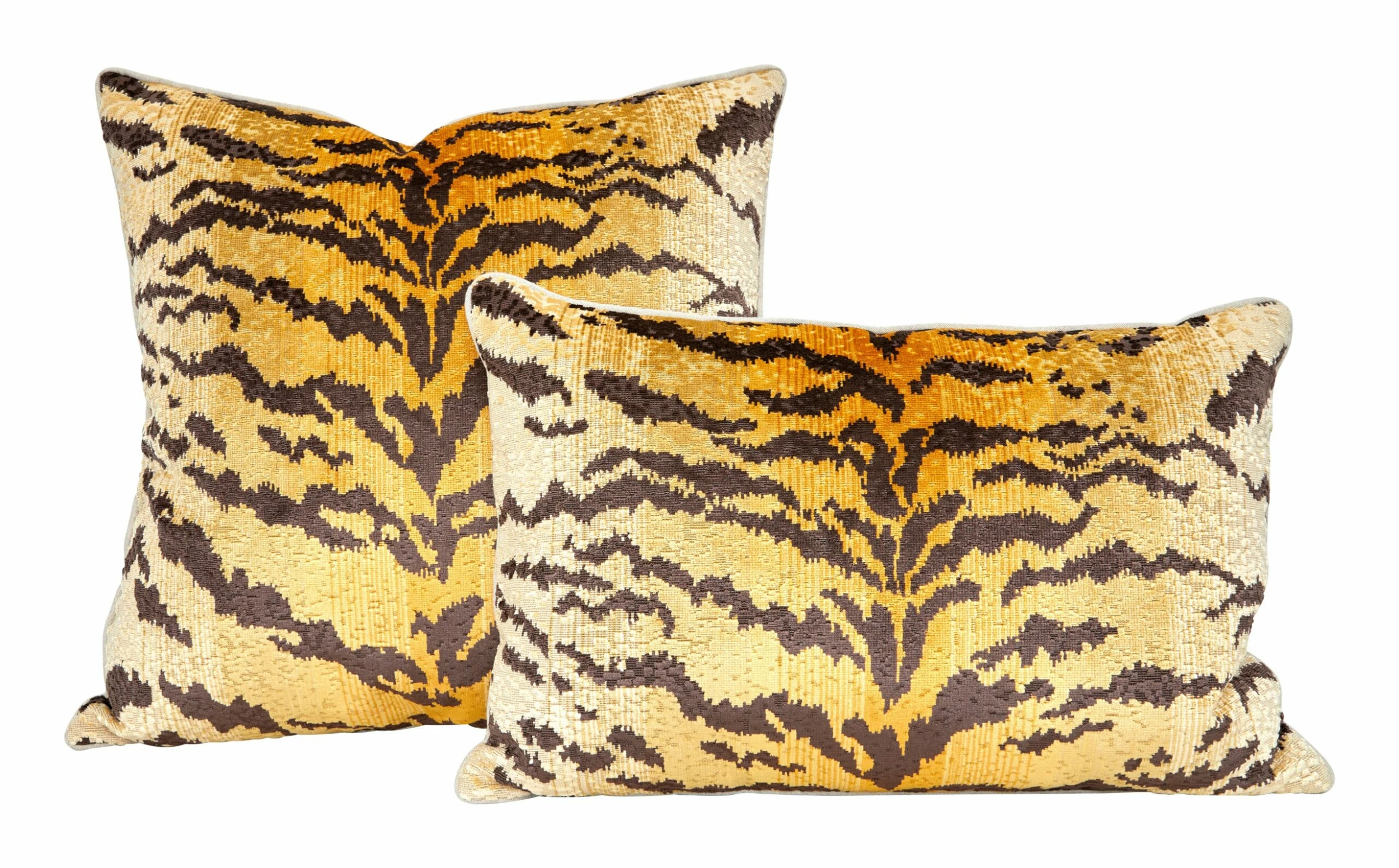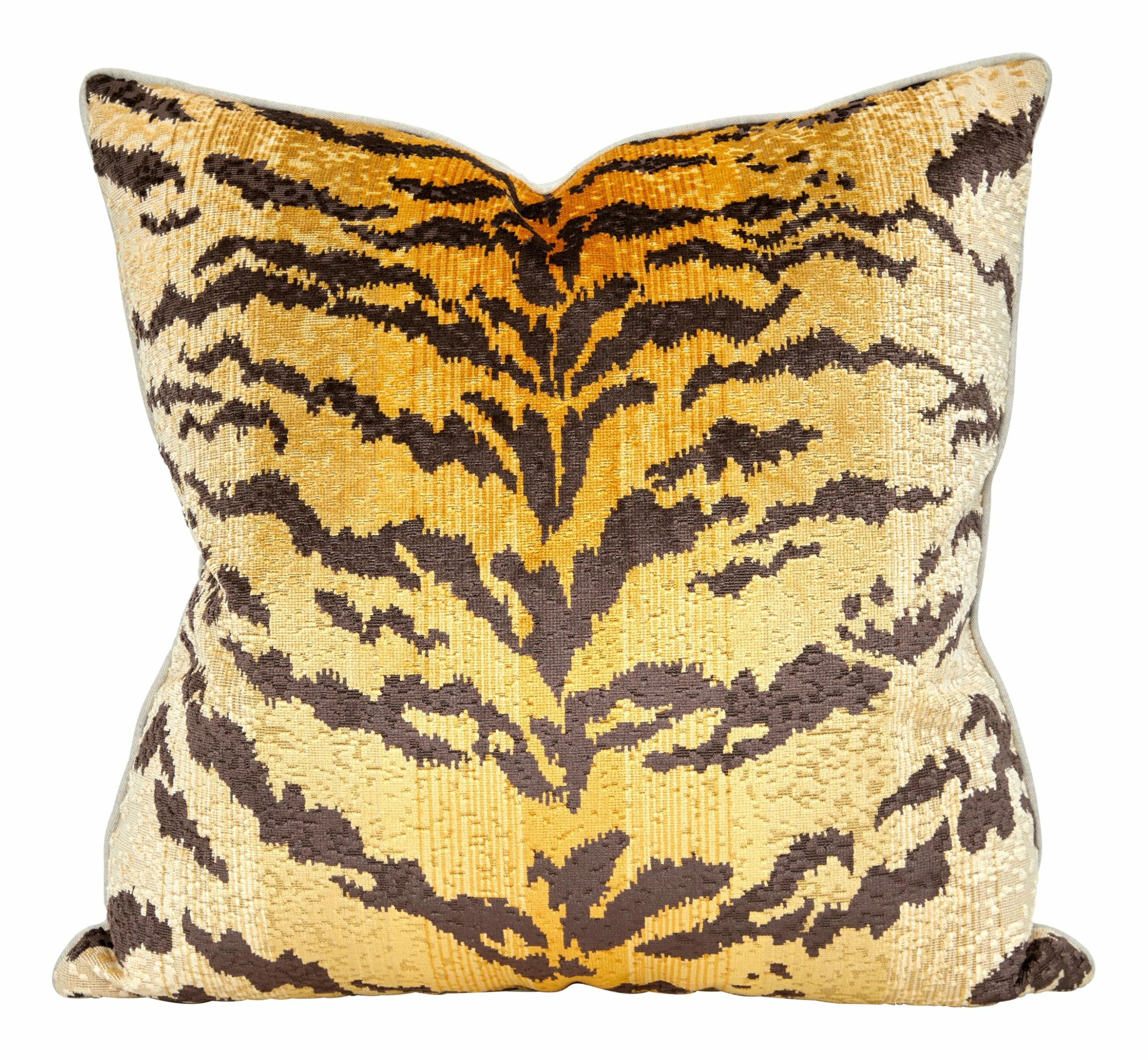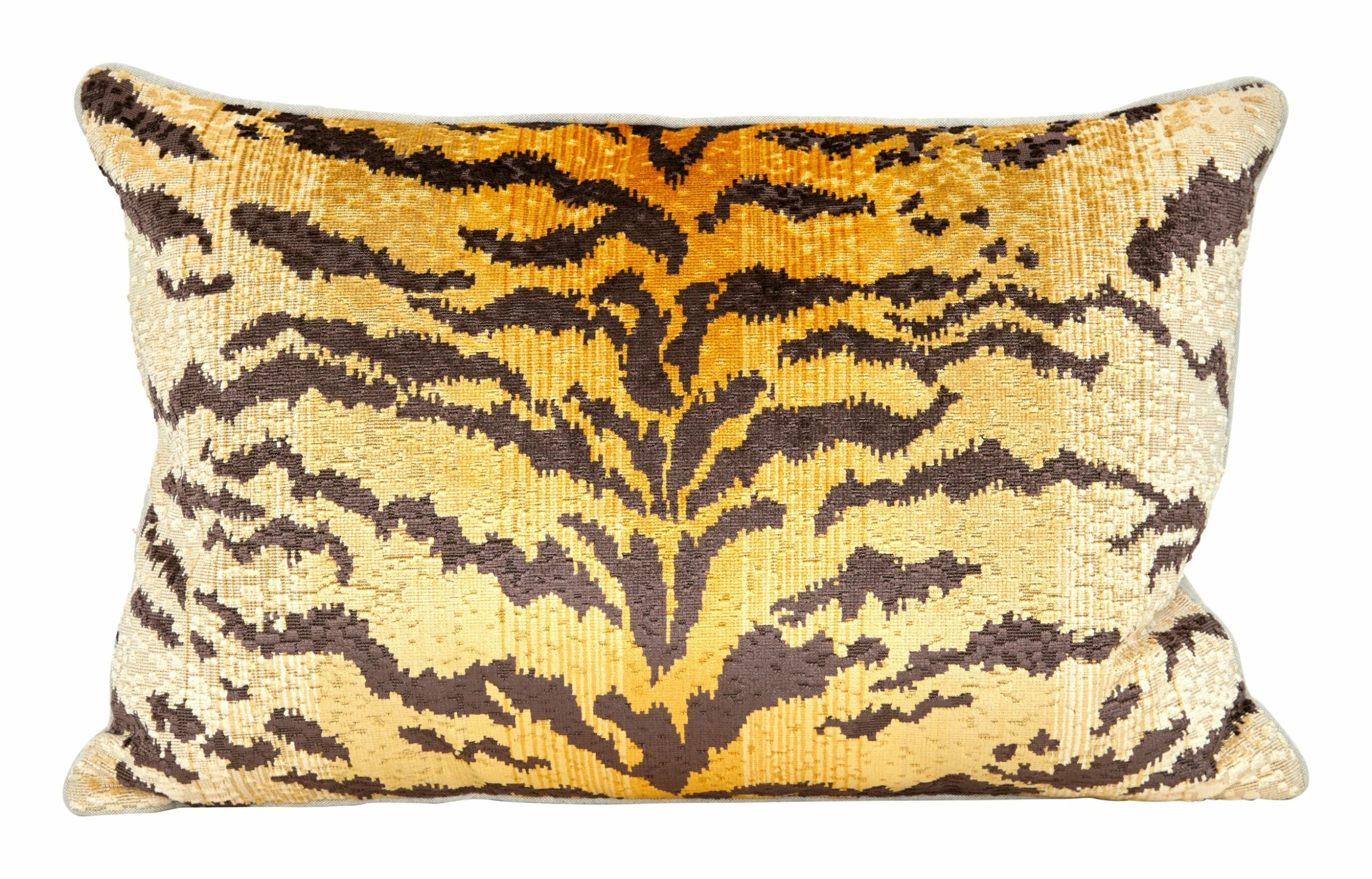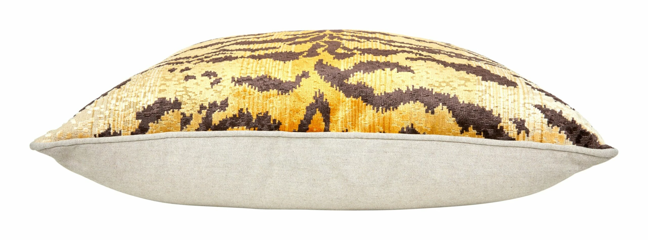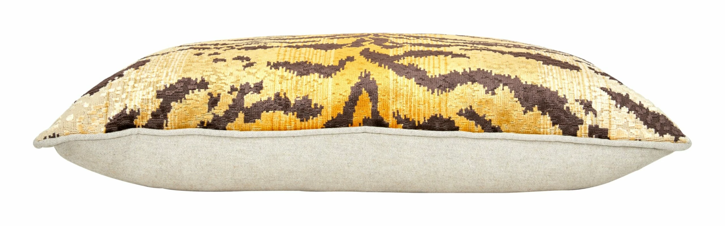 Add a stylish pop of animal print to any sofa or armchair with our sophisticated Farrah Pillow. Crafted from luxe cotton velvet, Farrah is decorated with stylized tiger stripes in a palette of deep brown and warm yellowy-amber. We’ve finished it with neutral linen backing, a hidden zipper closure and a soft down and feather insert for a plush feel. Perfect for adding a feline feel to any space, Farrah is sure to stand out all on its own but also mixes in well with other luxe patterned pillows in similar hues for a chic, maximalist vibe.Â