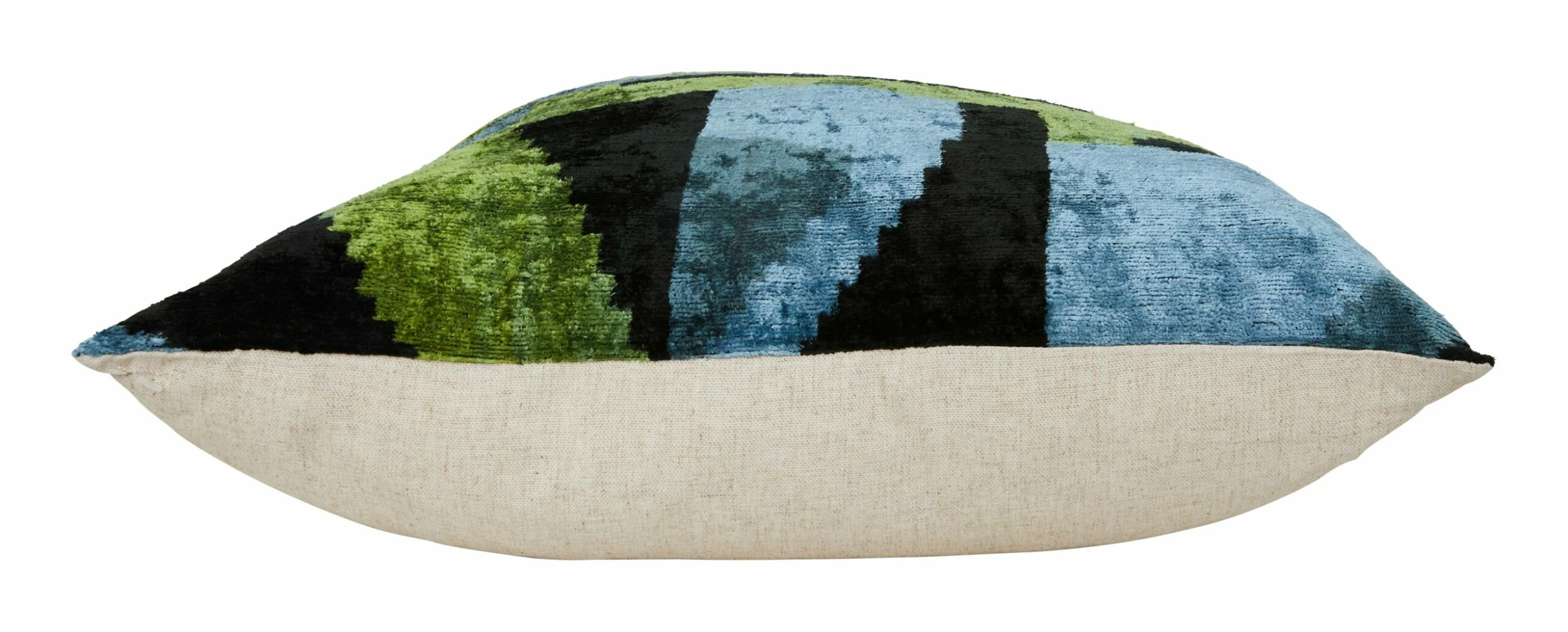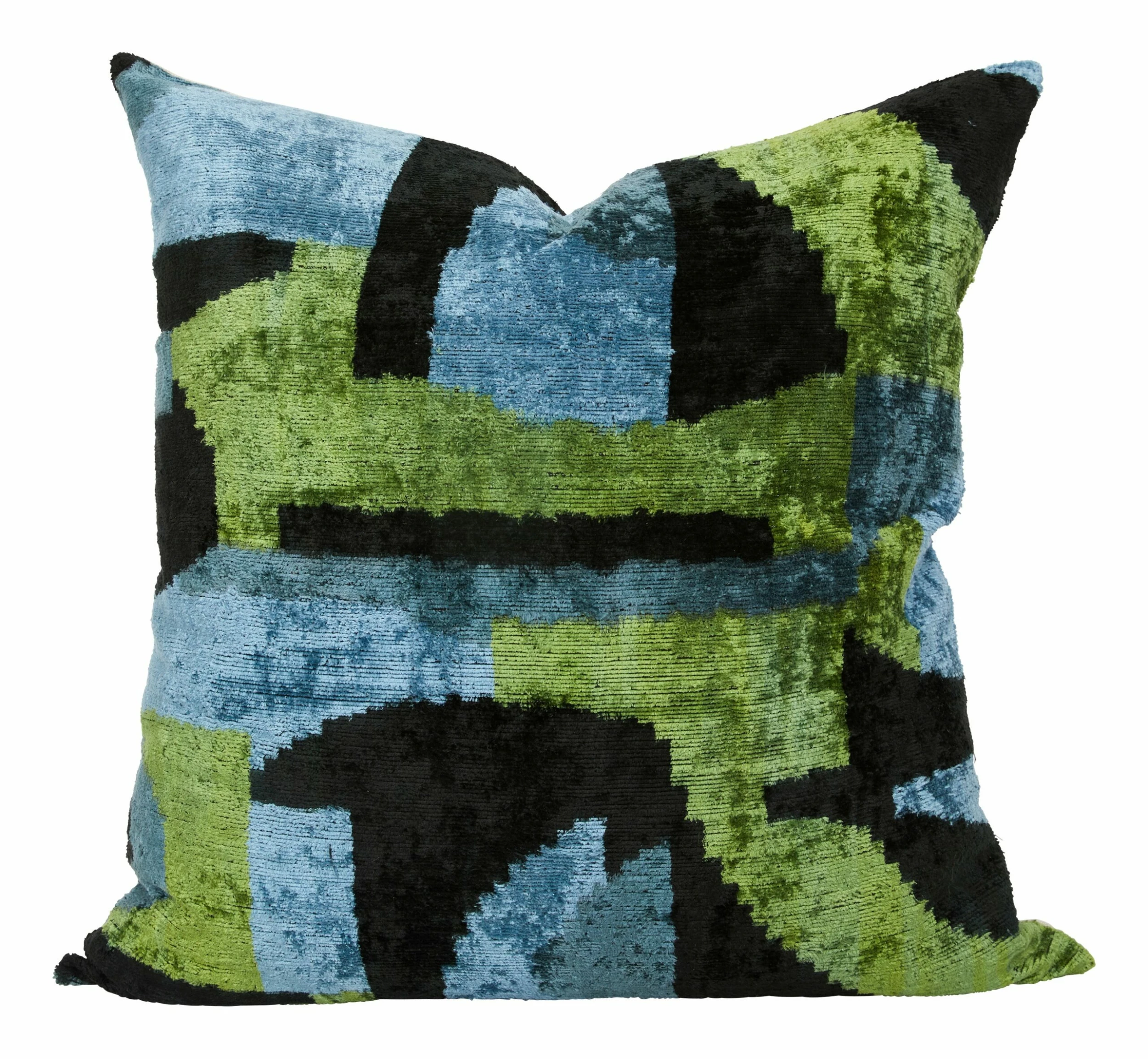 Add a jolt of color to your space with our eye-catching Gwyn Pillow. Made from super-soft silk velvet, Gwyn is crafted following traditional ikat techniques — a centuries-old resist-dyeing process that originated in Central Asia. In this method, threads are wrapped around a frame and individually tied off with pigment-resistant palm fibers before dyeing and weaving. With each new dye color, fibers are added or removed to create a colorful and uniquely intricate motif. Bold and vibrant, Gwyn is patterned with blocky, abstract shapes in cool shades of green, blue and black. We’ve finished it with neutral linen backing, a hidden zipper closure and a plush down and feather insert. Perfect as a layer in modern and boho spaces alike, Gwyn is sure to stand out all on its own but also looks lovely mixed in with a few of our other ikat pillows in a similar palette for an eclectic, global-chic feel.Â