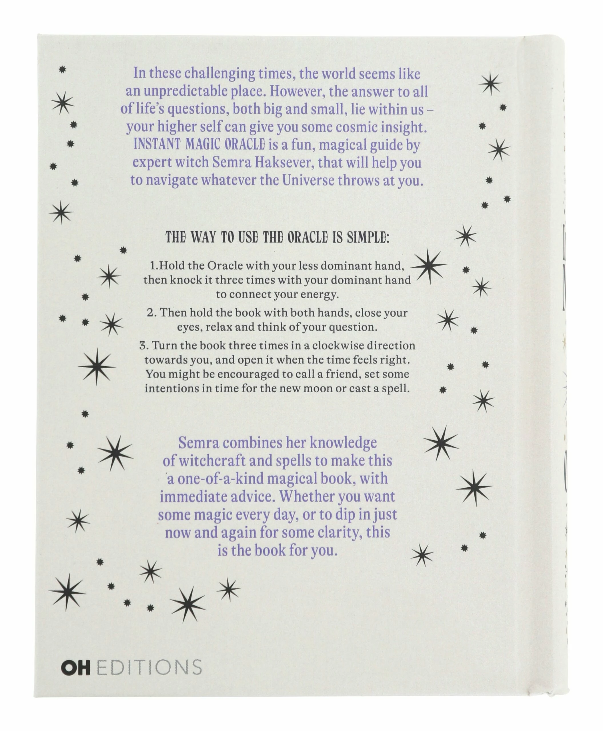 Navigate whatever life throws at you with Instant Magic Oracle. From healer and eclectic witch Semra Haksever, this fun, magical guidebook was created to help you get in touch with your higher self and your own inner wisdom by leading you to messages, visualizations and cosmic tools from the Universe. No prior knowledge of the esoteric is required to use this book; simply hold it in your hands, focus on your question, turn it three times and open it to whatever page feels right. There, you’ll find everything from insights, affirmations and advice to spells, rituals and intuition challenges. Sit with whatever message you receive and you may be led to an answer that was always within you. As beautiful in design as it is rich in knowledge, these prompts are all printed on gorgeous purple paper and paired with a curiously strange illustration. The perfect resource in these uncertain times, this little book is great both for those who want some magic every day and those who are just looking to dip in once in a while for a bit of clarity