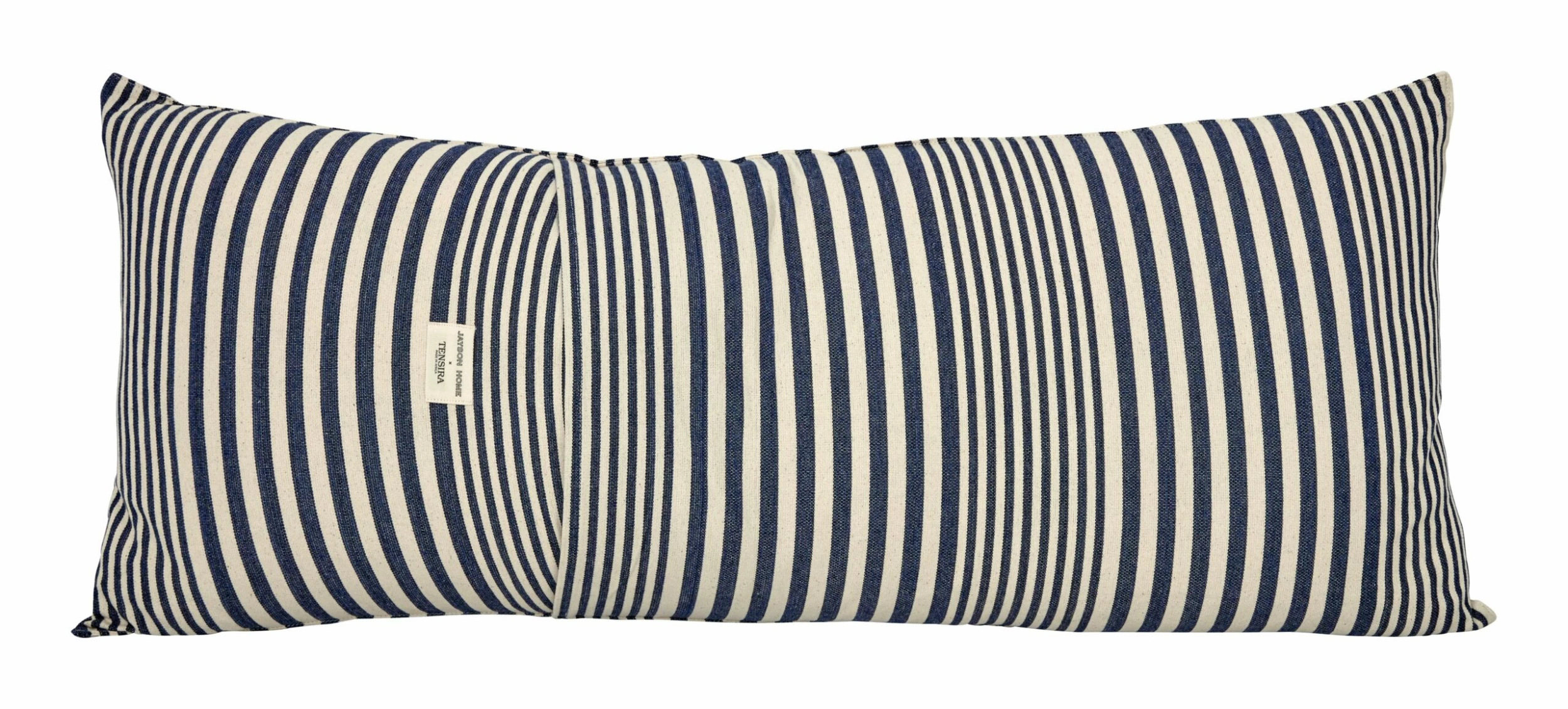 Classic stripes get a fresh, new look with our JH x Tensira Kendall Bolster Pillow. This extra-long throw pillow was created in collaboration with Tensira — a celebrated textile house founded by a Guinean and Finnish husband-and-wife team that blends Scandinavian aesthetics with ancestral West African weaving and dyeing techniques. We dreamed up Kendall’s simple yet unexpected design in-house, drawing on vintage French ticking and the varied band sizes found on India’s traditional striped dhurrie rugs. Tensira’s team of skilled craftswomen then brought our design to life using cotton that was spun and woven by hand and indigo-dyeing methods that have been passed down for generations. Finally, we finished it off with a plush down and feather pillow insert for soft, sink-in comfort. The perfect blend of European elegance and global authenticity, we love Kendall standing solo on the bed for a simple finishing touch or mixed in with our other JH x Tensira Pillows on a spacious sofa or sectional for an effortlessly chic feel. Â
