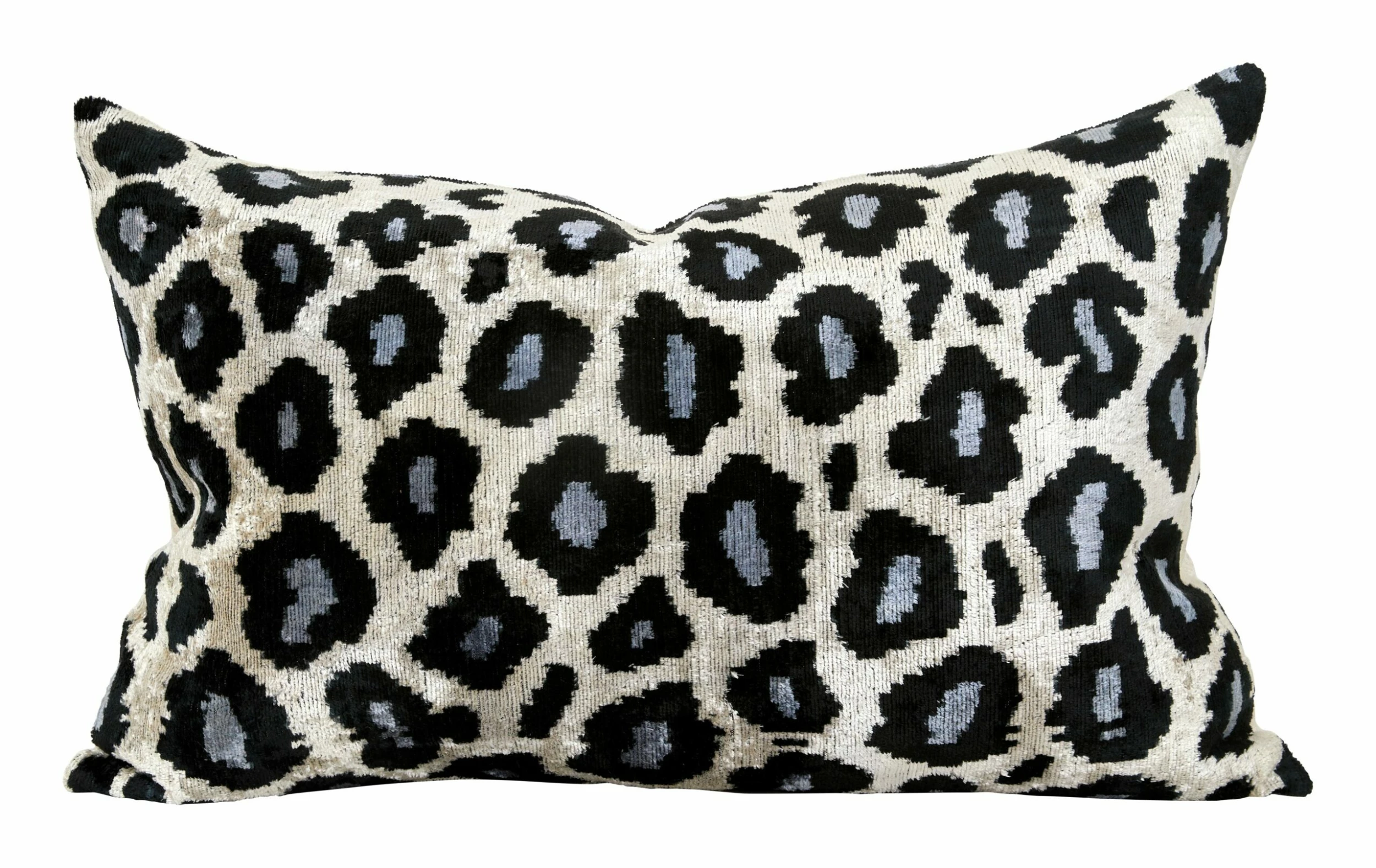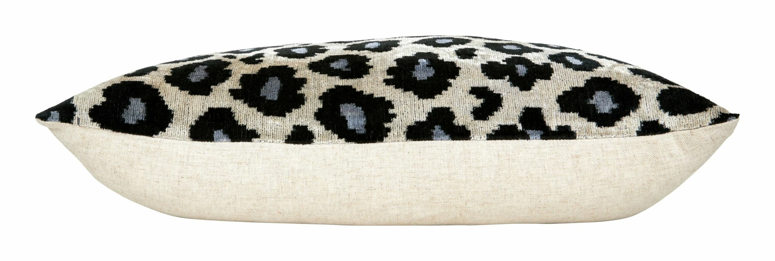Add a global vibe to your sofa or bed with our effortlessly cool Kip Pillow. Made from super-soft silk velvet, Kip is crafted following traditional ikat techniques — a centuries-old resist-dyeing process that originated in Central Asia. In this method, threads are wrapped around a framed and individually tied off with pigment-resistant palm fibers before dyeing and weaving. With each new dye color, fibers are added or removed to create a colorful and uniquely intricate motif. Bold and vibrant, Kip is patterned with chic leopard spots in black and cool slate blue on a cream-colored ground. We’ve finished it with neutral linen backing, a hidden zipper closure and a plush down and feather insert. Perfect for bringing an unexpected pop of animal print to modern and boho spaces alike, our Kip Pillow will stand out all on its own but also looks great mixed in with a few of our other ikat pillows for an eclectic feel.Â