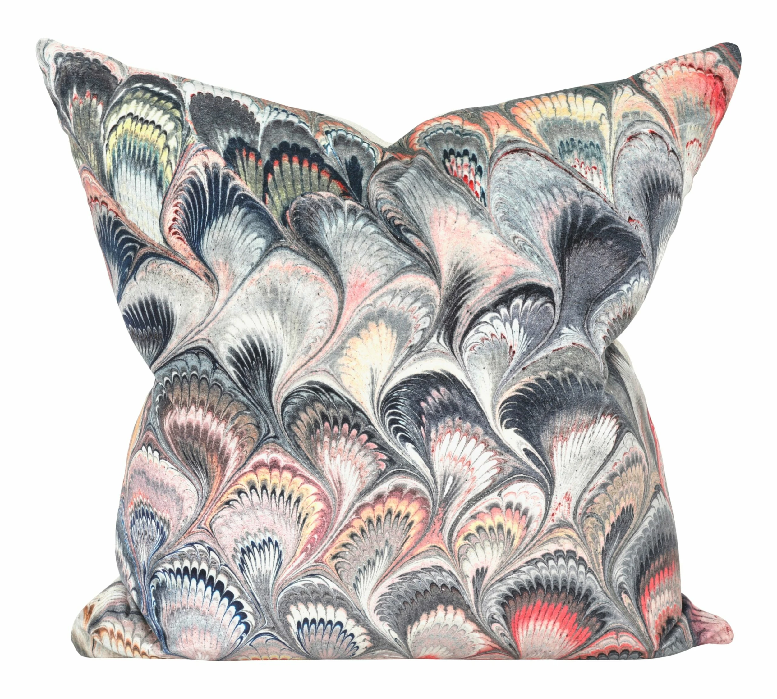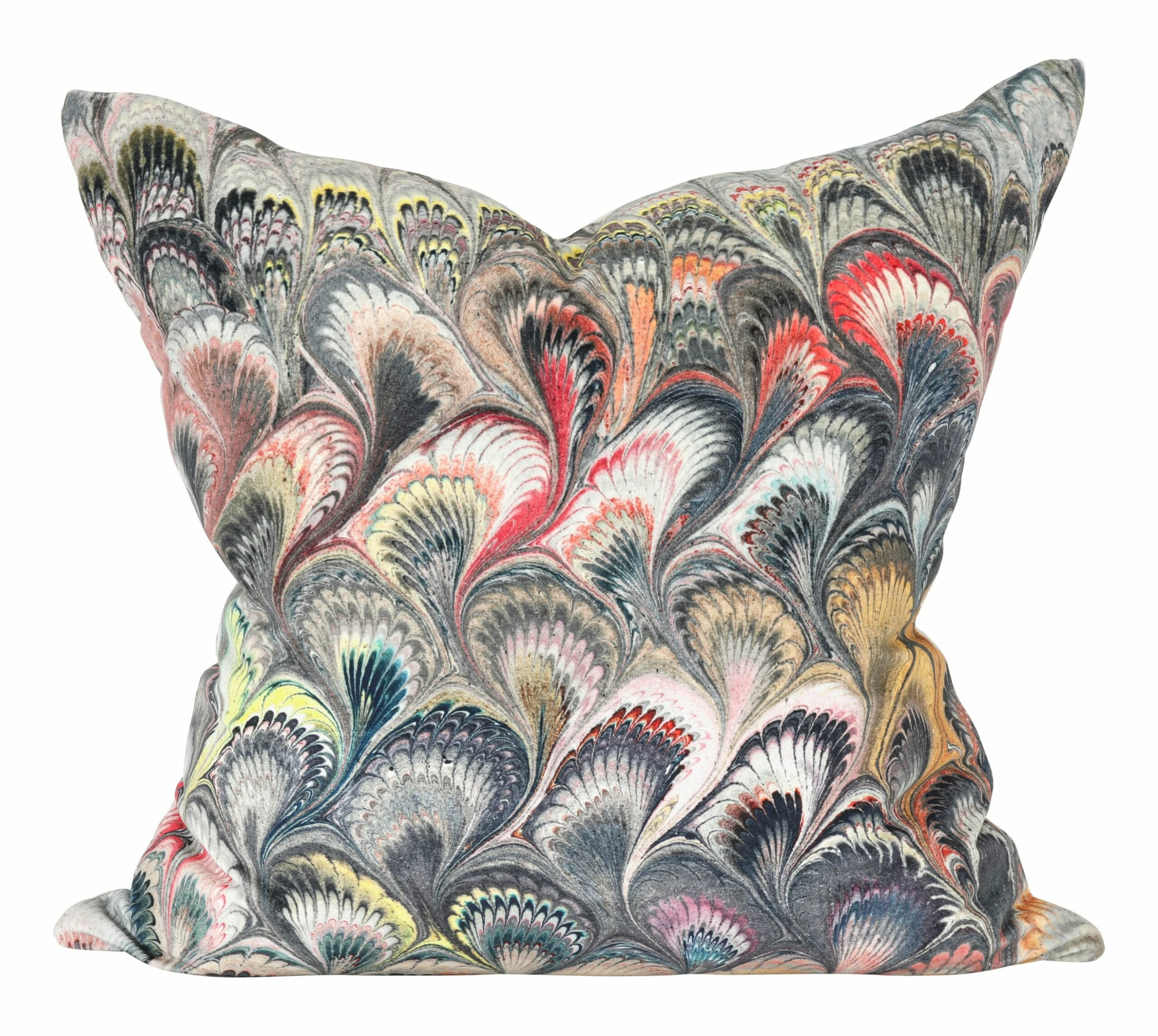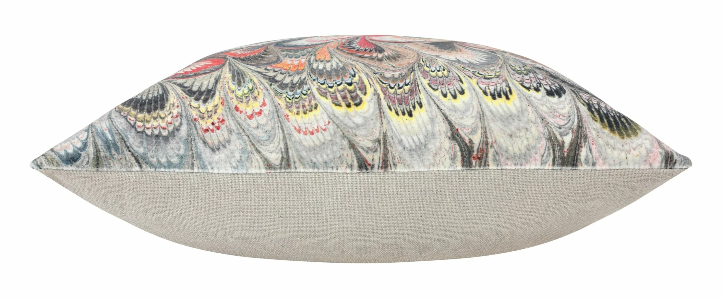 With its rich texture and swirling, psychedelic pattern, our Lourdes Pillow makes the perfect finishing touch for modern and traditional spaces alike. This sumptuous layer features a soft velvety front decorated with a lively, organic design in a multitude of shades, inspired by the handmade marbleized endpapers found at the beginnings and ends of old books. We’ve finished it with a solid natural linen backing, a hidden zipper closure and a luxe down and feather insert for a plush feel. Great for adding a pop of color wherever it’s needed, we love Lourdes as a matching pair on the sofa or mixed in with other vibrant layers on the bed.