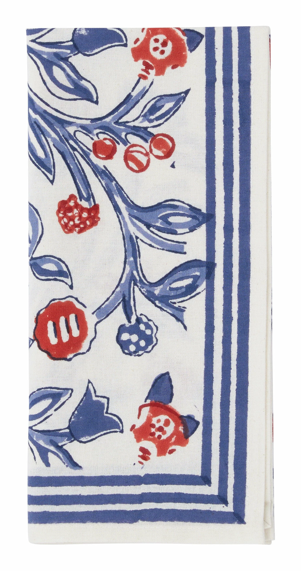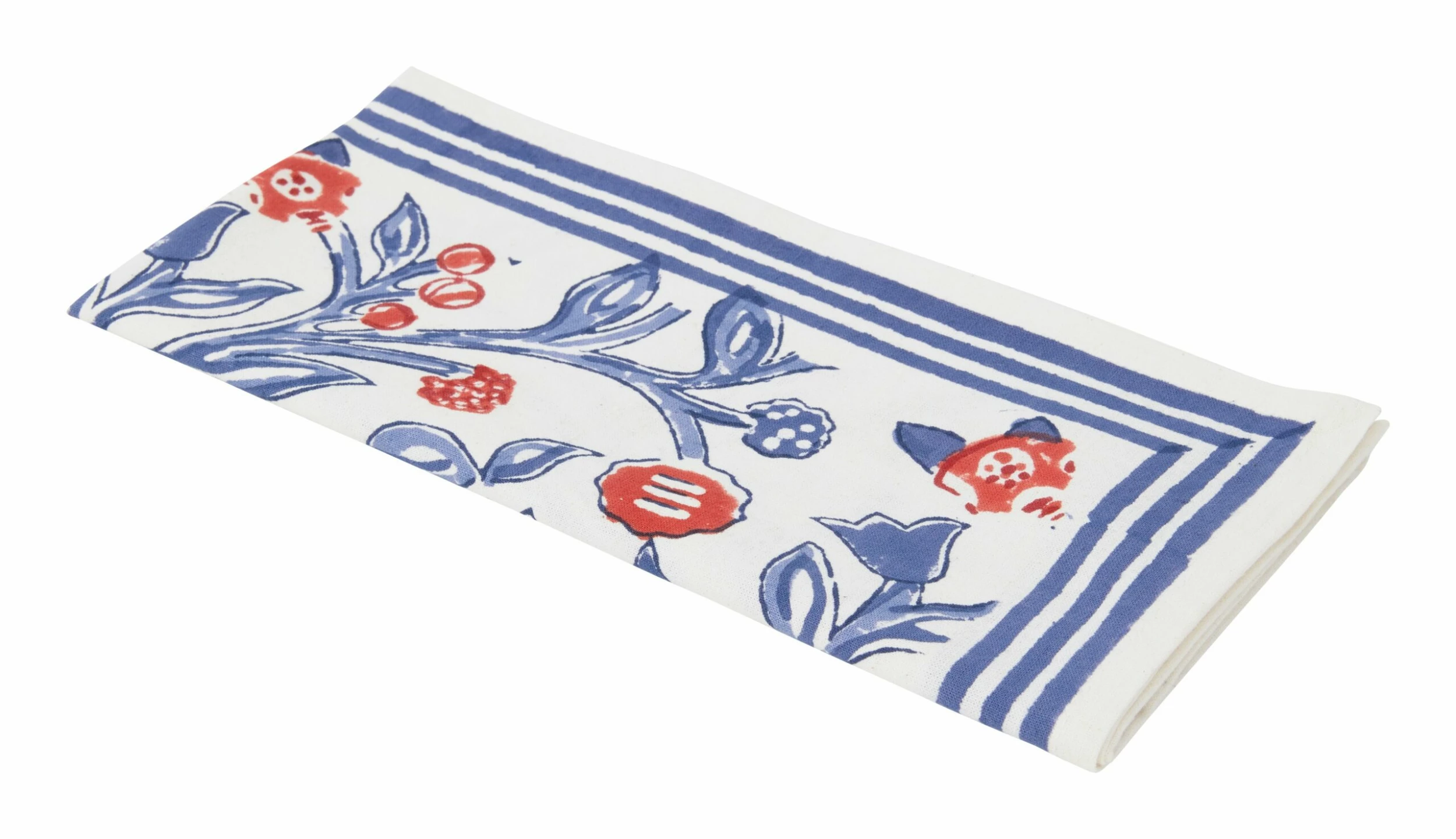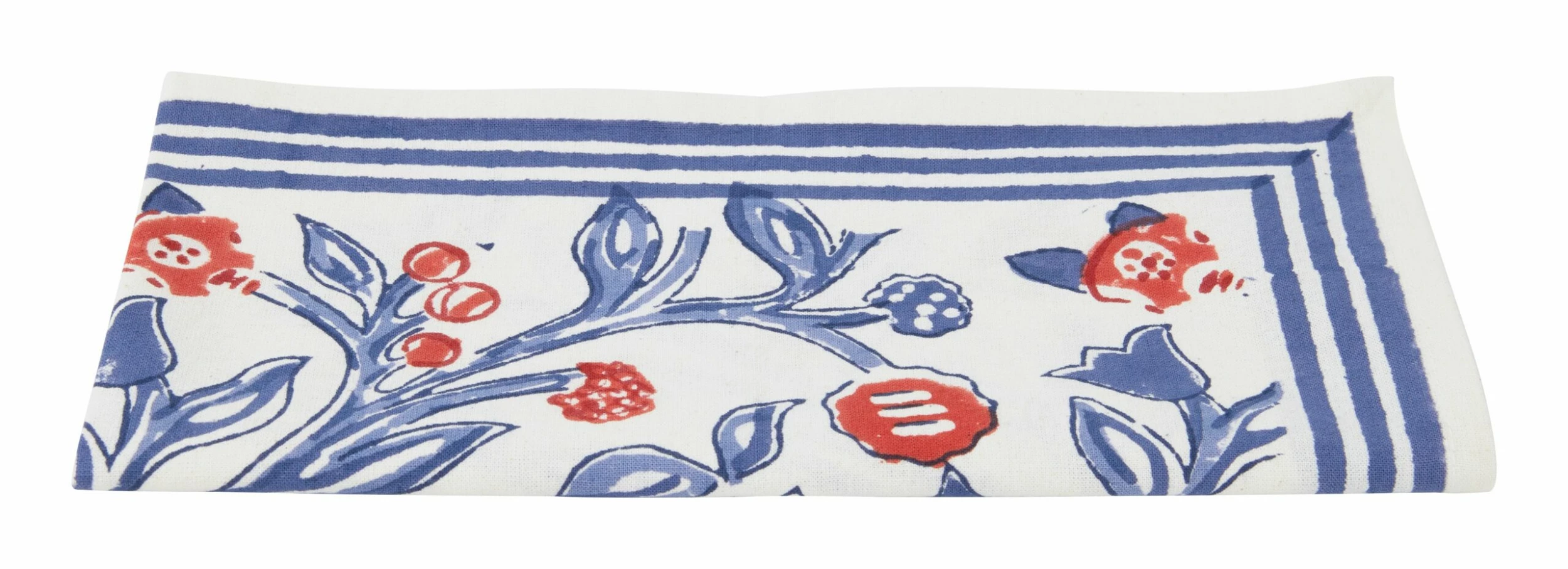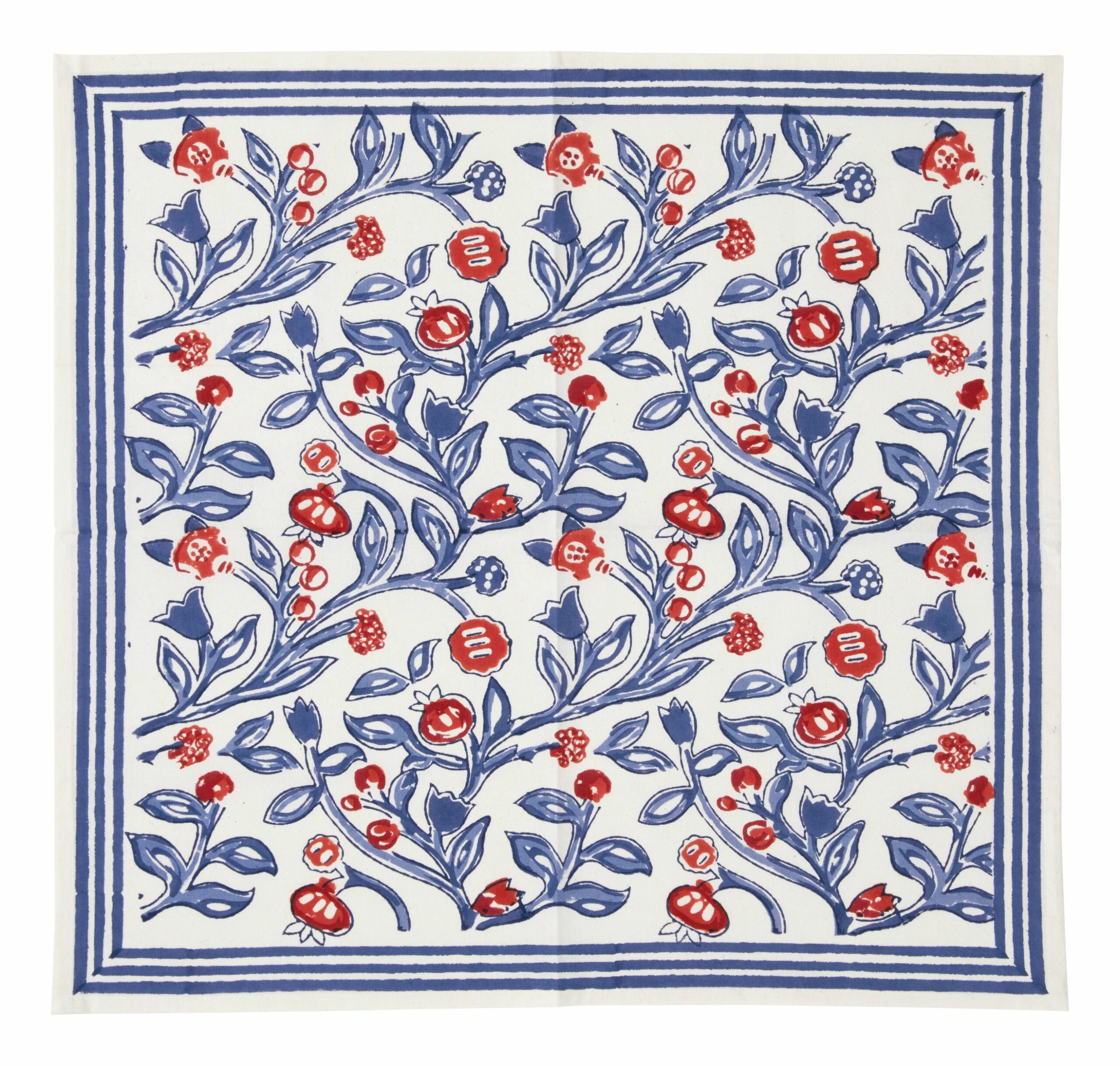 Brighten up your place settings with a collection of our charming Mabel Napkins. Handmade in India from soft, lightweight cotton, these linens are block-printed following traditional methods to feature a stylized floral design in vibrant shades of blue, red and white. Great for the everyday and special occasions alike, our Mabel Napkins are perfect for bringing a pop of color to a casual kitchen table or for adding a global-chic vibe to a sophisticated dining table.Â