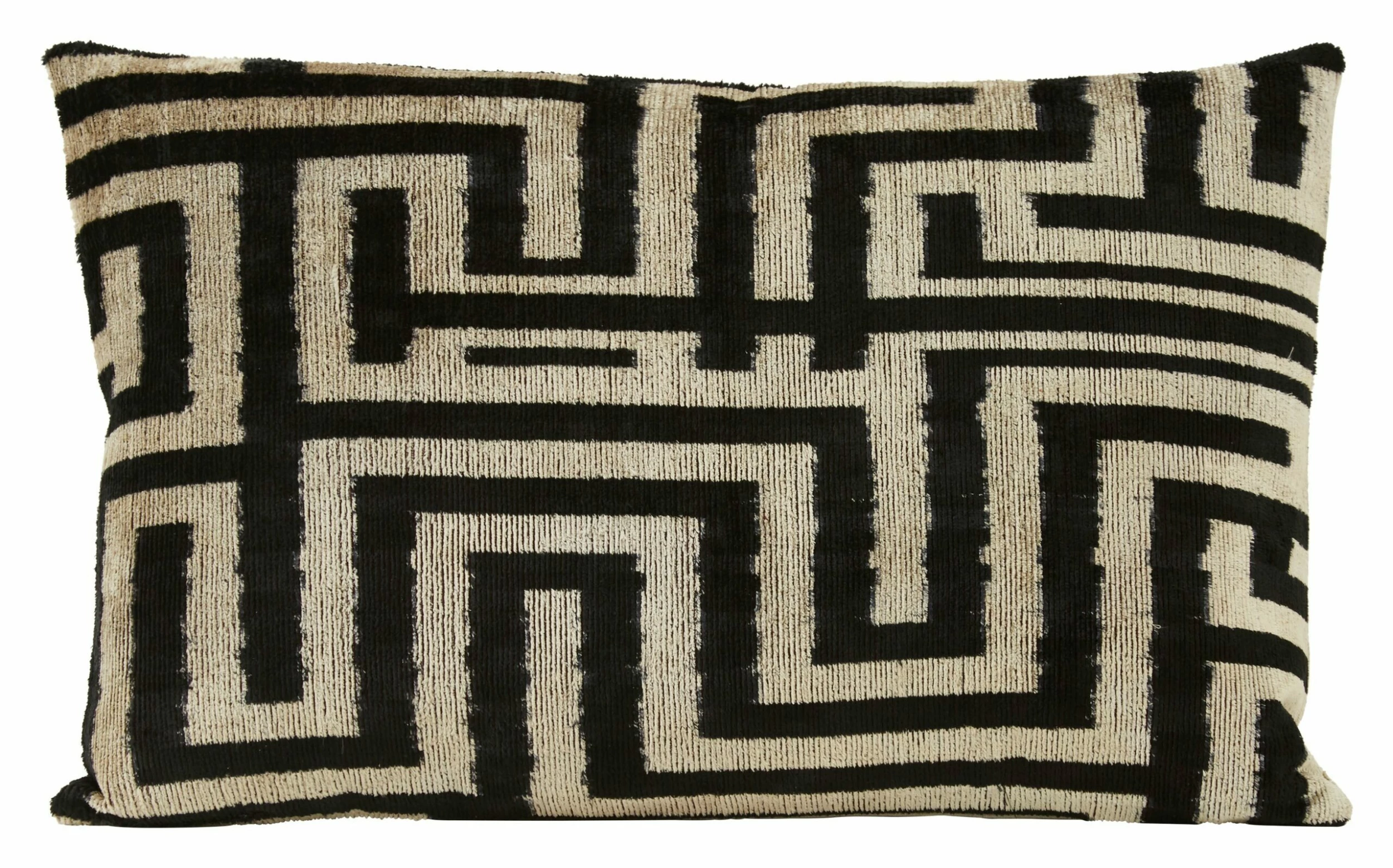 Bring a global-chic feel to your sofa or bed with our Mailer Pillow. Made from super-soft silk velvet, Mailer is crafted using traditional ikat techniques — a centuries-old resist-dyeing process that originated in Central Asia. In this method, threads are wrapped around a frame and individually tied off with pigment-resistant palm fibers before dyeing and weaving. With each dye color, fibers are added or removed to create colorful and uniquely intricate motifs. Mailer features a mesmerizing maze-like pattern in a simple palette of black and cream. We’ve finished it with neutral linen backing, a hidden zipper closure and a plush down and feather insert. Perfect as a layer in modern and boho spaces alike, we love Mailer on its own or mixed in with other pillows in a similar palette.