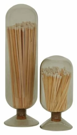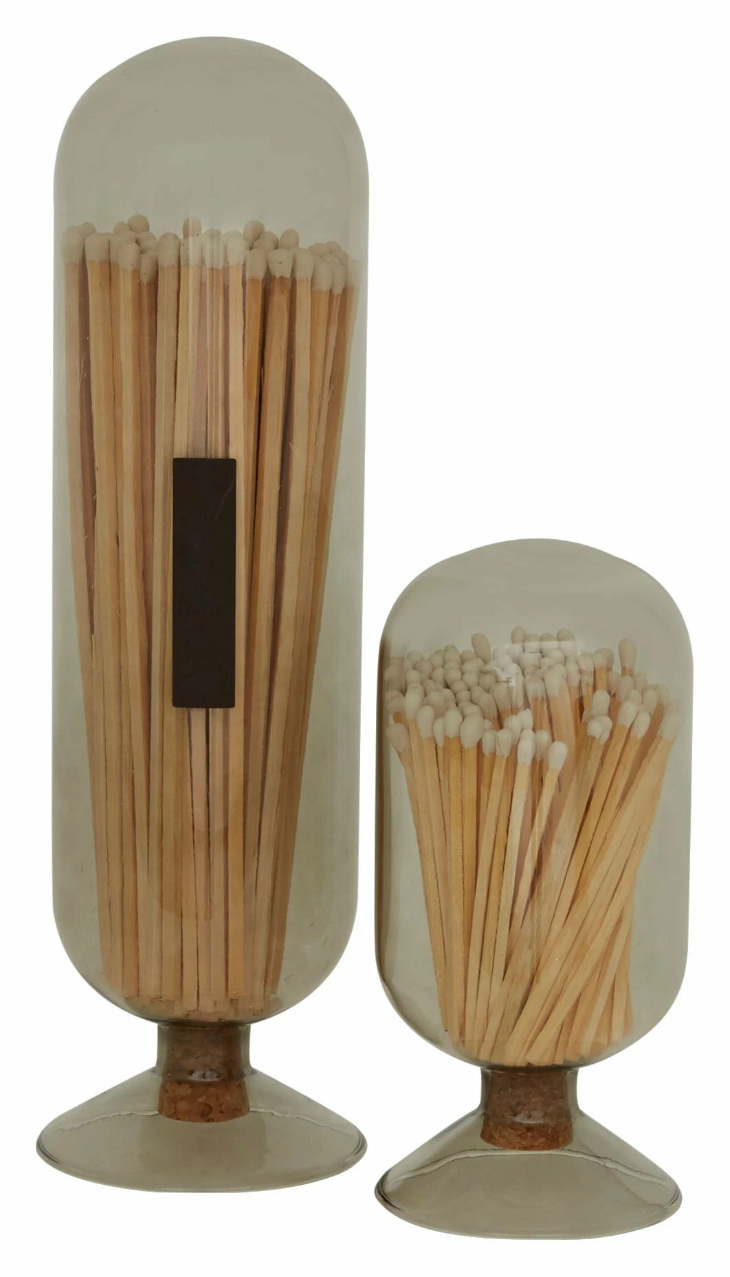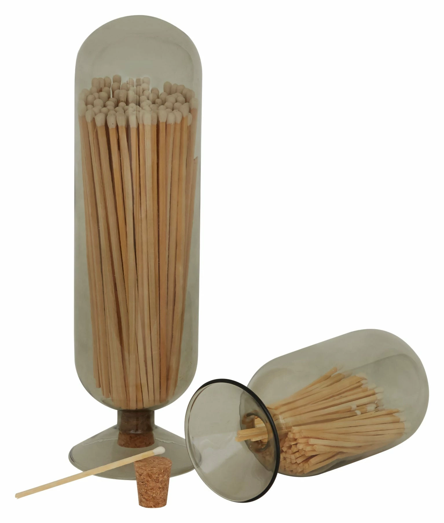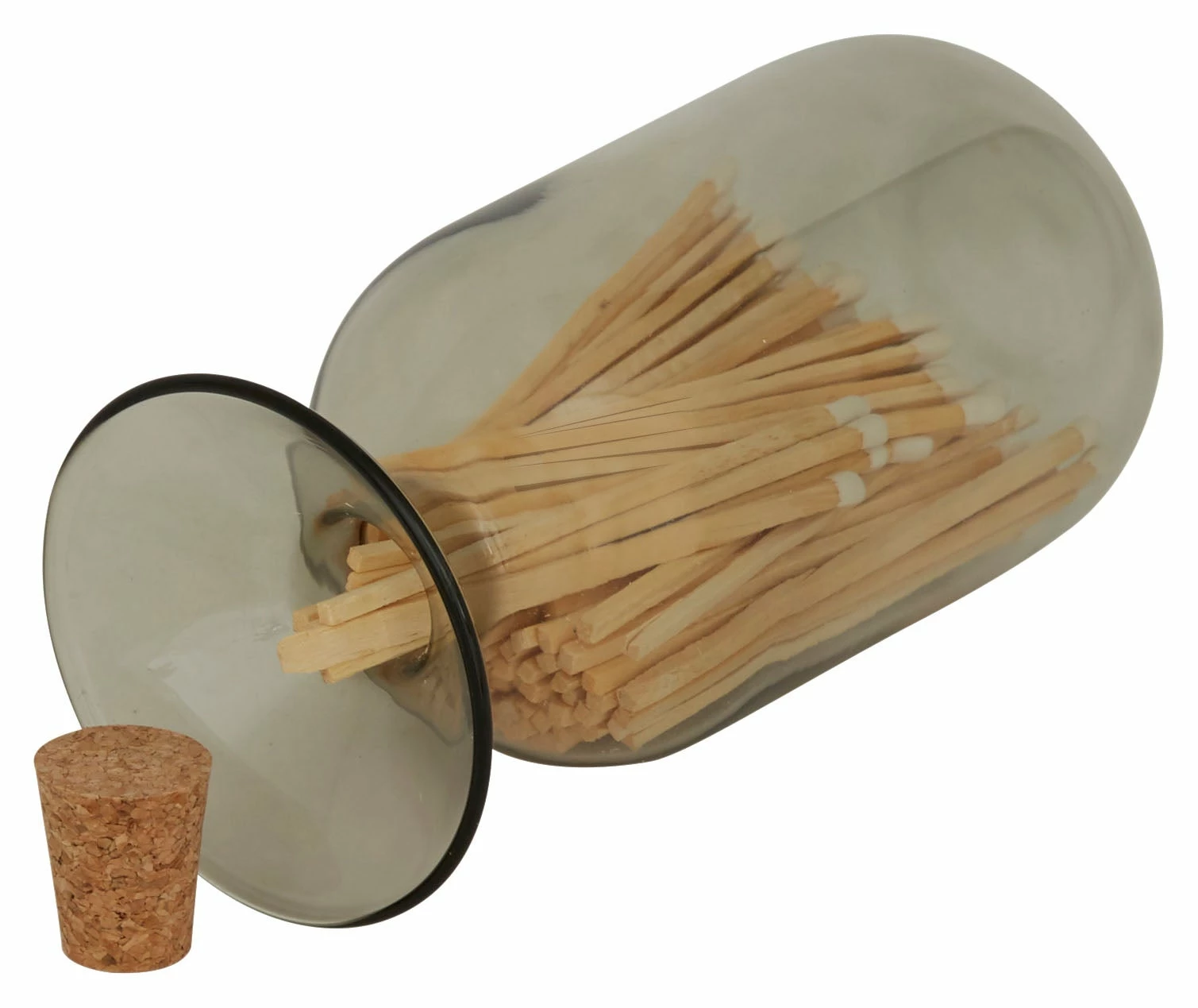 Set the mood for a cozy night in with our chic Match Cloches. Hand blown from smoky glass, this clever footed design contains 120 natural matches, held in place by a cork stopper. A handy flint strip on the side of the bottle makes a simple task of striking each match. Keep the smaller size on the coffee table next to your favorite candle or place the larger fireplace length version on the mantel for the next time you’re building a fire. Easy to refill once the matches are gone, it can also be repurposed for displaying a small curiosity or bit of flora, as a tribute to its vintage garden cloche feel. We love it as a thoughtful gift to your favorite homebody, especially when paired with one of our throws or candles.