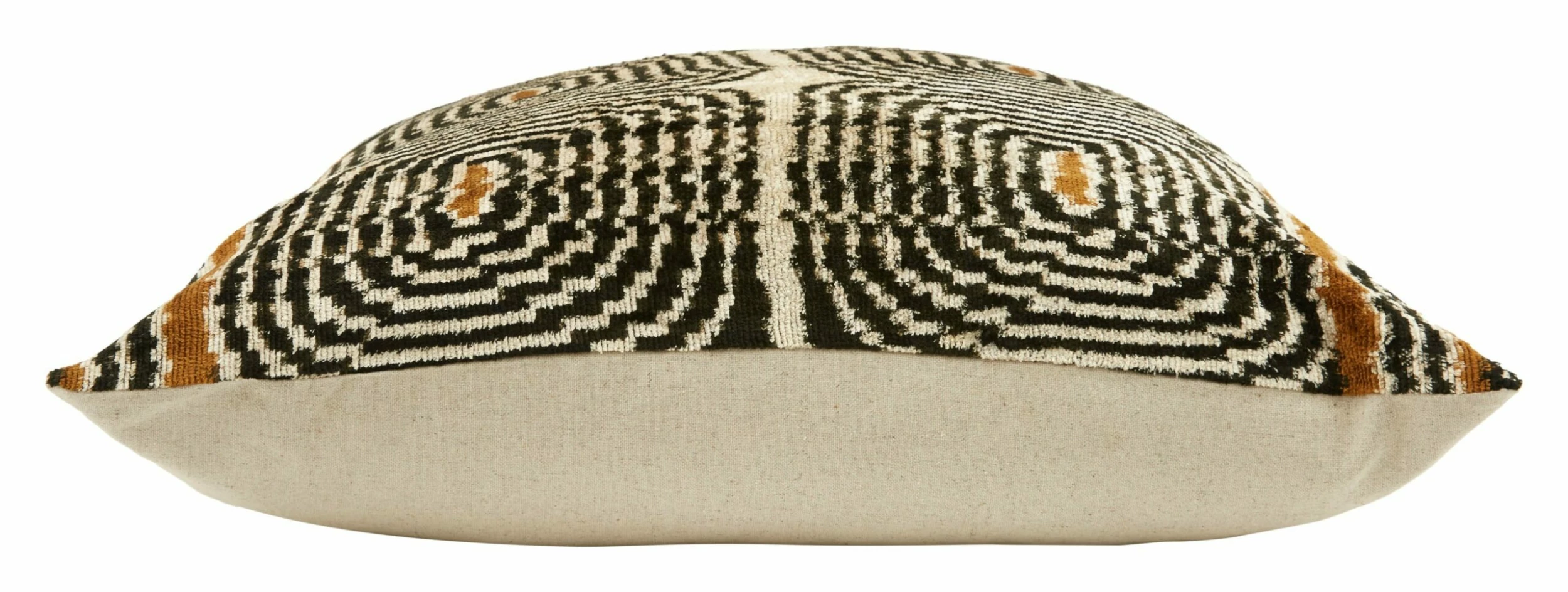 Bring a global-chic vibe to your sofa or bed with our hypnotic Roan Ikat Pillow. Made from super-soft silk velvet, Roan is crafted using traditional ikat techniques — a centuries-old resist-dyeing process that originated in Central Asia. In this method, threads are wrapped around a frame and individually tied off with pigment-resistant palm fibers before dyeing and weaving. With each dye color, fibers are added or removed to create colorful and uniquely intricate pattern. Roan features a mesmerizing motif made up of concentric circles in shades of black, cream and warm caramel. Perfect as a layer in modern and boho spaces alike, we love Roan on its own or mixed in with other pillows in a similar palette.