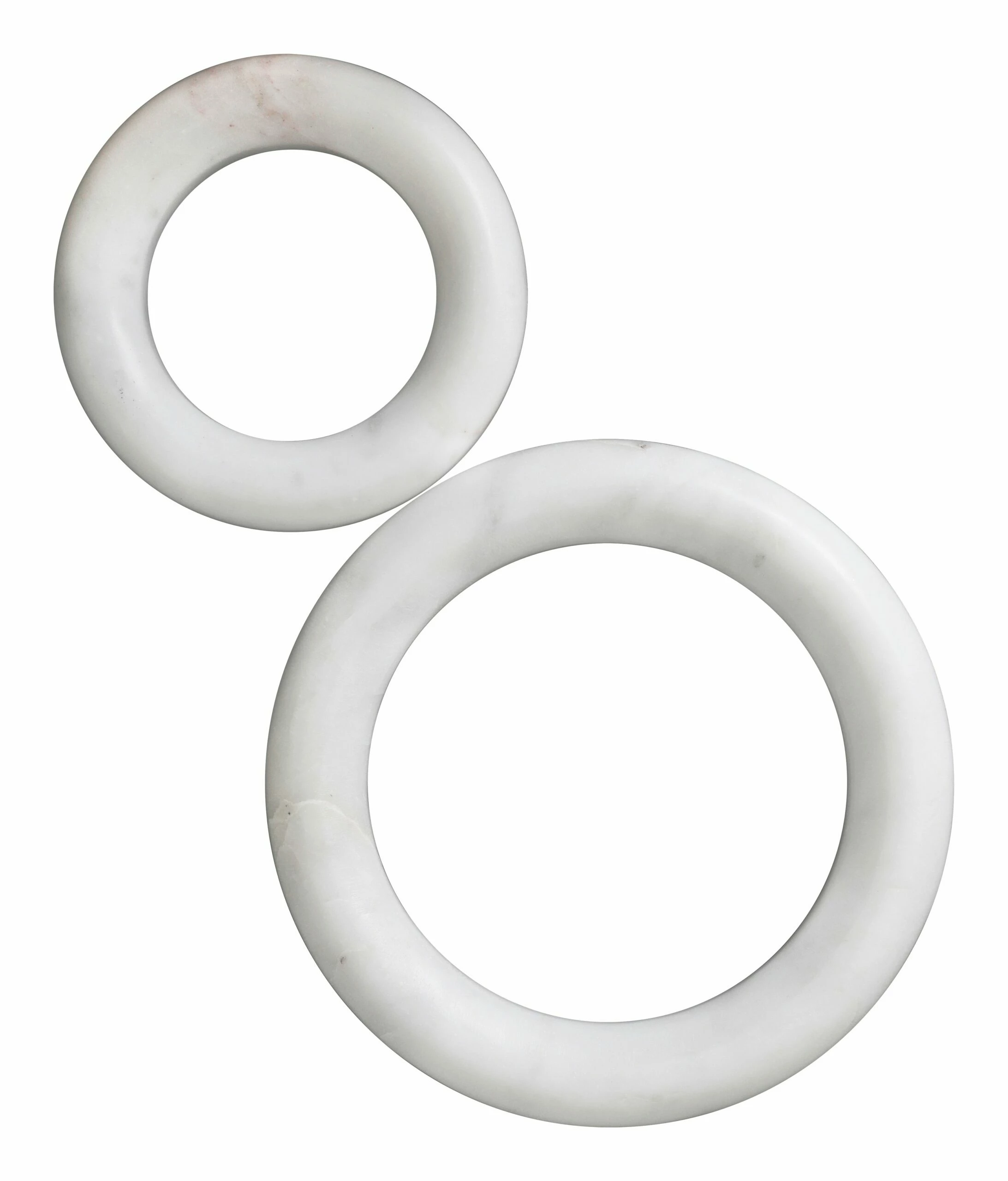 Protect your surfaces, but make it chic. Our sleek Saturn Trivets are crafted cool white marble into simple, ring-like shapes and feature organic touches of grey and light brown veining that make each one unique. A useful addition to any home’s serveware collection, use our Saturn Trivets to keep your tables and countertops safe from hot pots and dishes. We love that they’re also as pretty as they are practical, meaning that they can be left on display even when not in use.