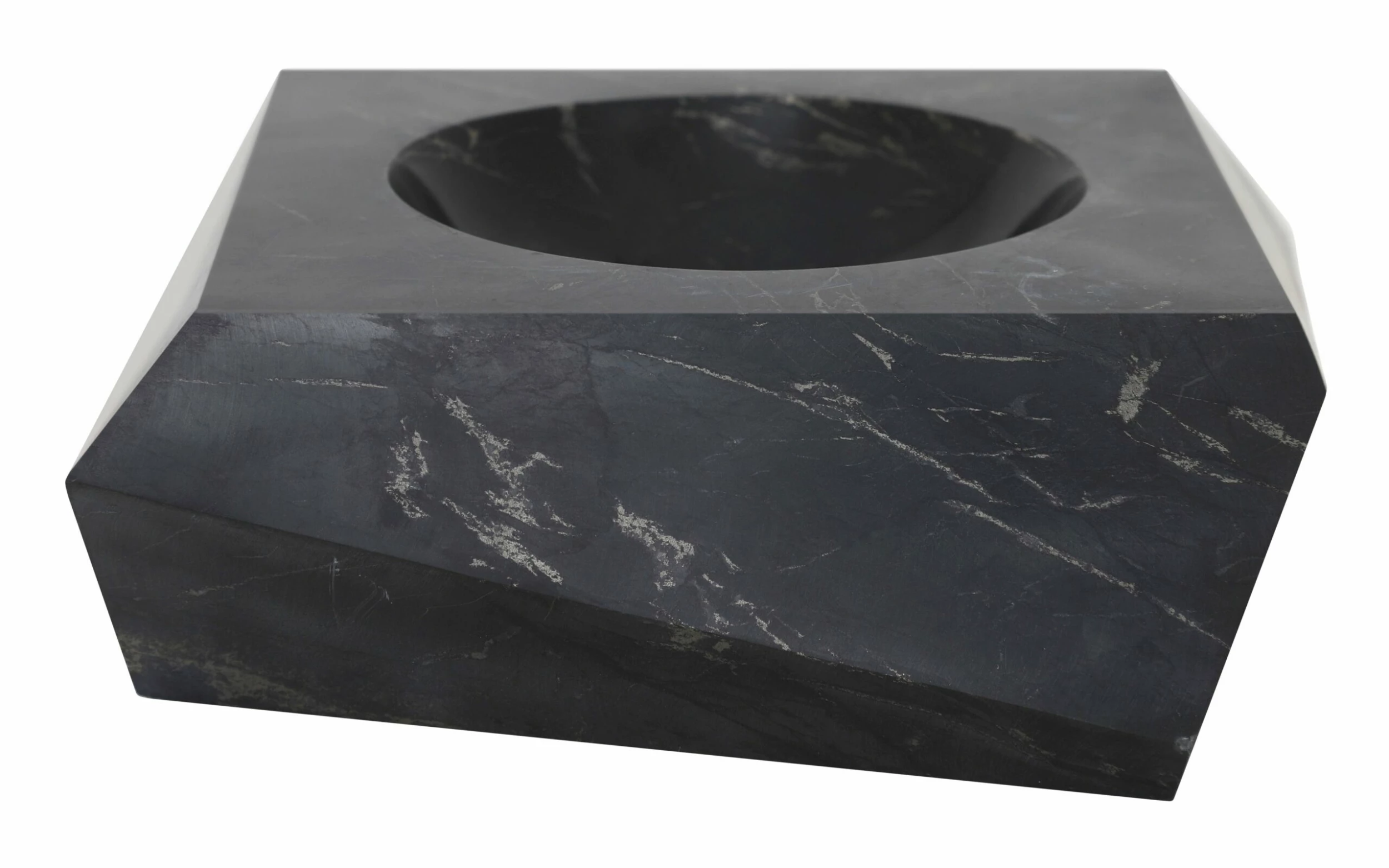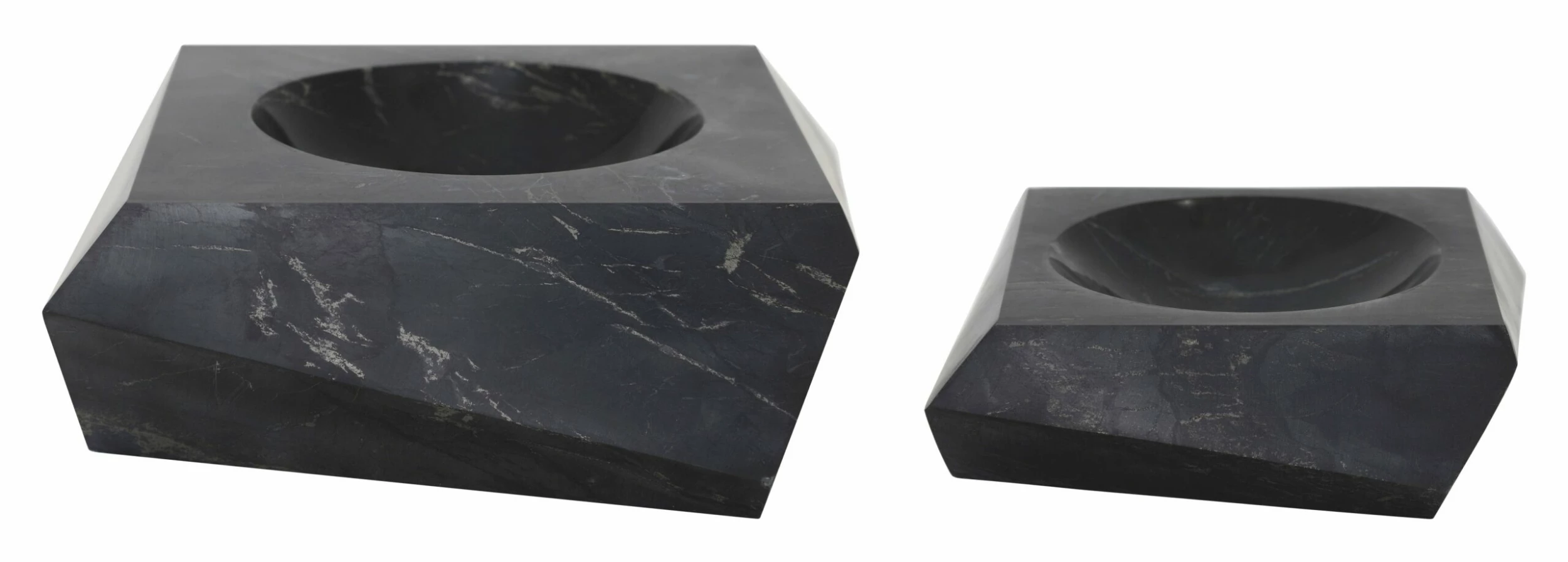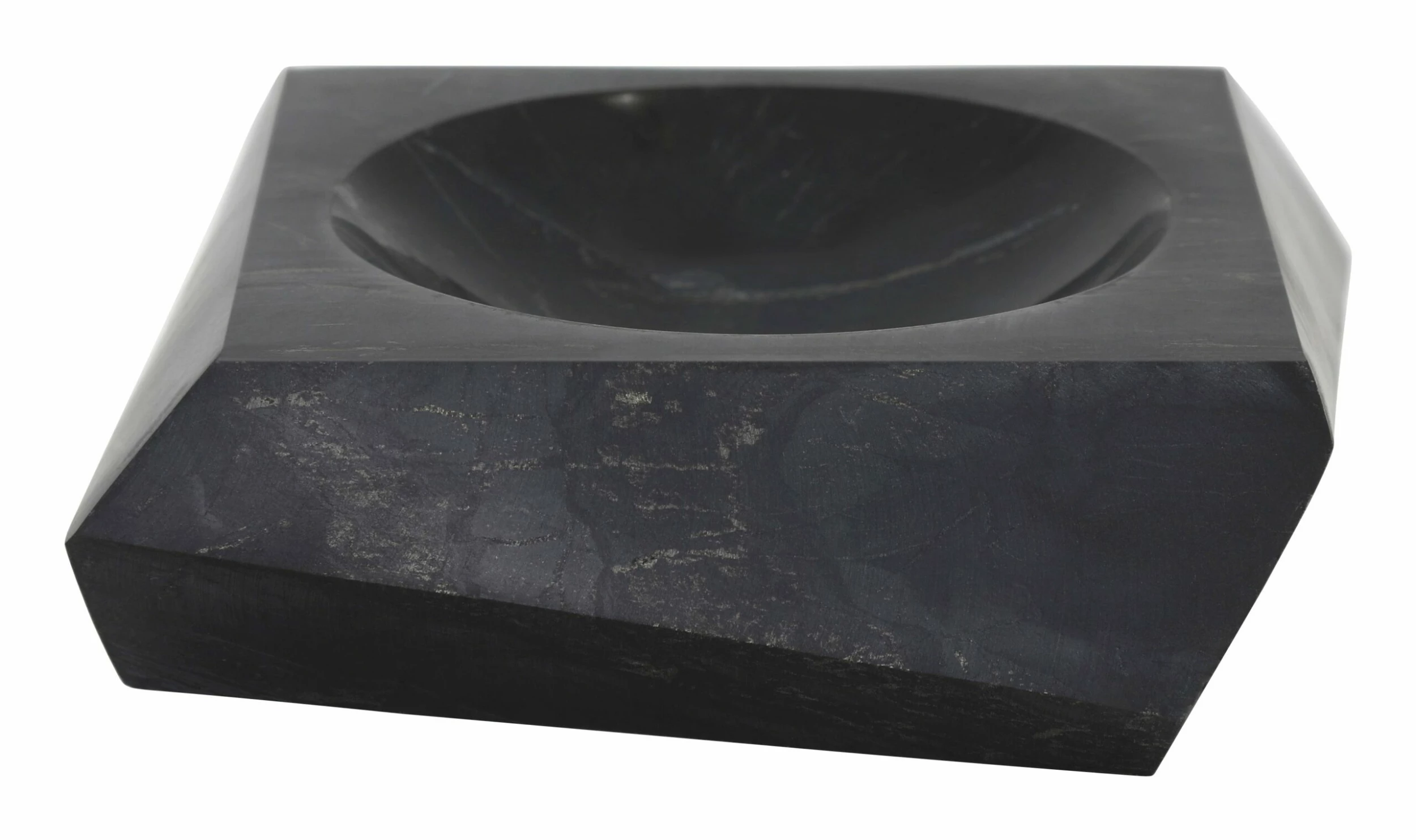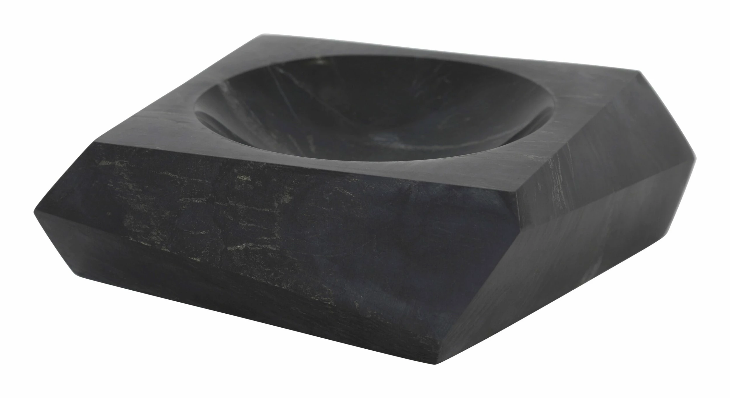 Chic and simple, our monolithic Taurus Bowl is the perfect finishing touch for any modern space. Crafted from cool black marble with touches of grey and white veining, this weighty dish pairs a minimal, blocky shape with angular, slanting edges. The entire piece has a matte honed finish with the exception of the shallow rounded bowl at its center, which has been polished for a smooth, glossy feel. Great as a statement-making catchall in any room of the house, we love Taurus for holding keys and coins on the entryway console, cradling jewelry and other keepsakes on the dressing table or collecting odds and ends in style on the coffee table.