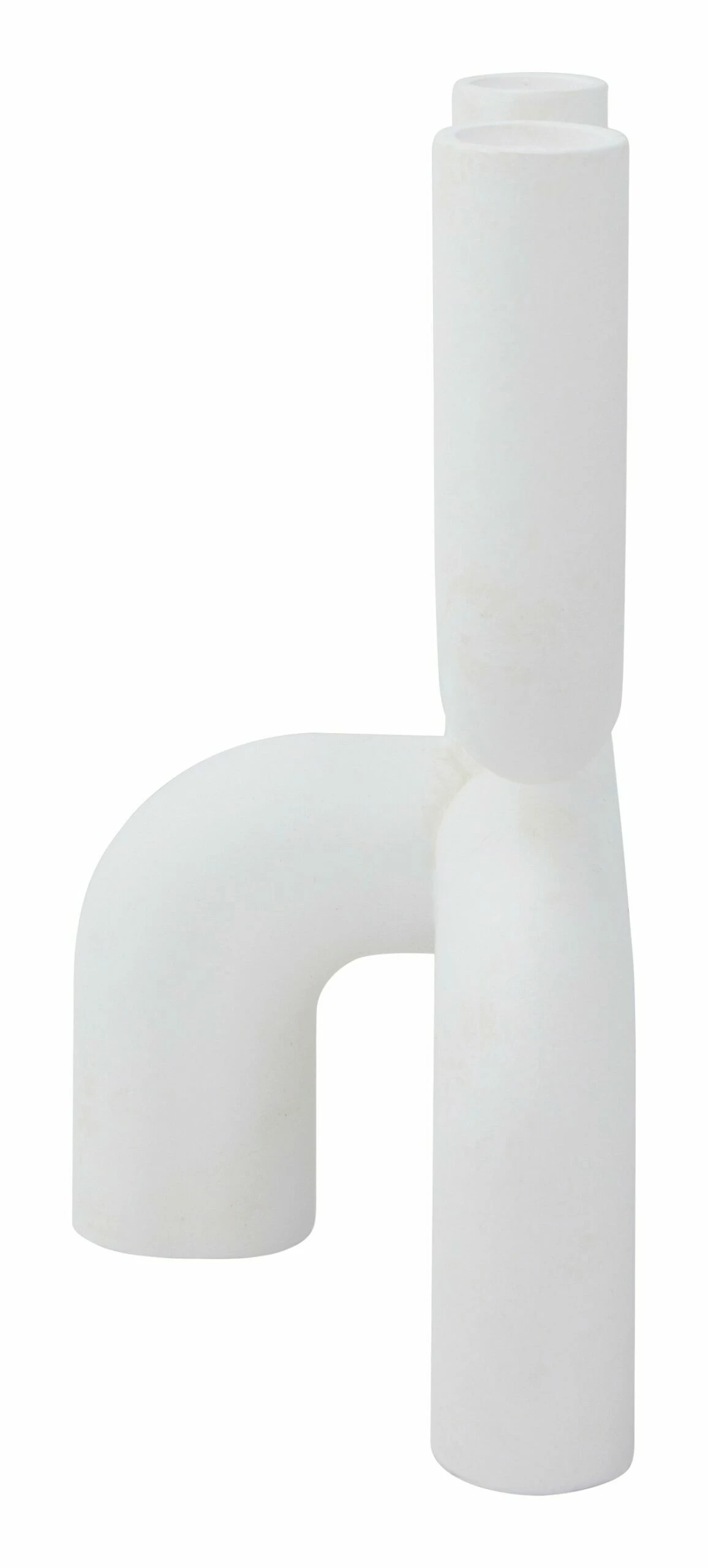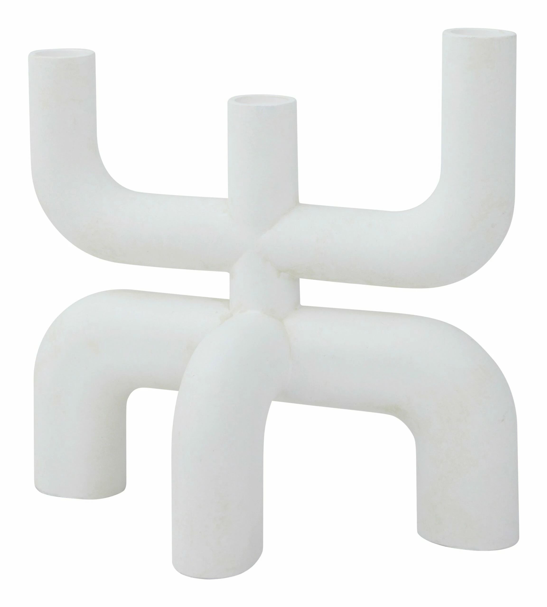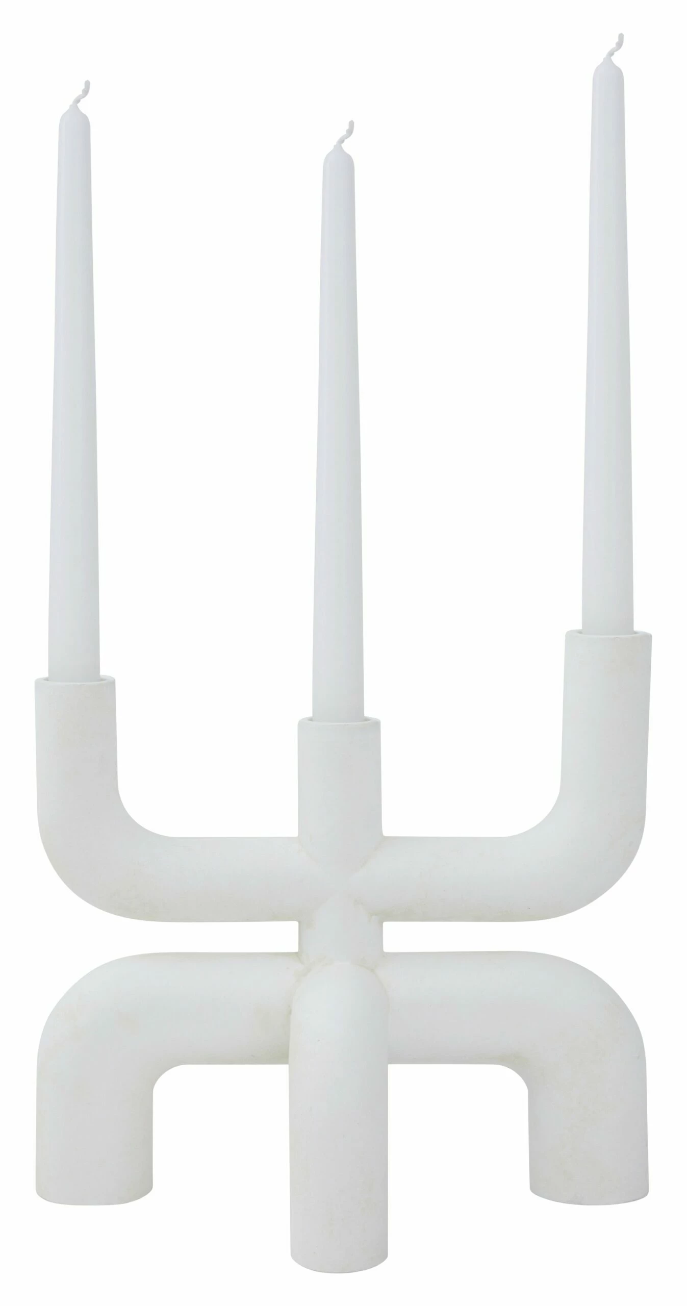 Bring a bit of avant-garde edge to any tabletop vignette with our tubular Tier Taper Holder. All sleek lines and curved edges, this modern candelabra is crafted from ceramic to feature an asymmetrical, three-legged base and three openings at varying heights that are each perfectly sized to hold a standard taper candle. All of this is coated with a matte bone white hand-glazed finish, making each one a little unique. Sure to add a touch of playful, minimalist style wherever it goes, we love Tier casting a cozy glow on the dining table or adding a sculptural element to a mantel or side table.