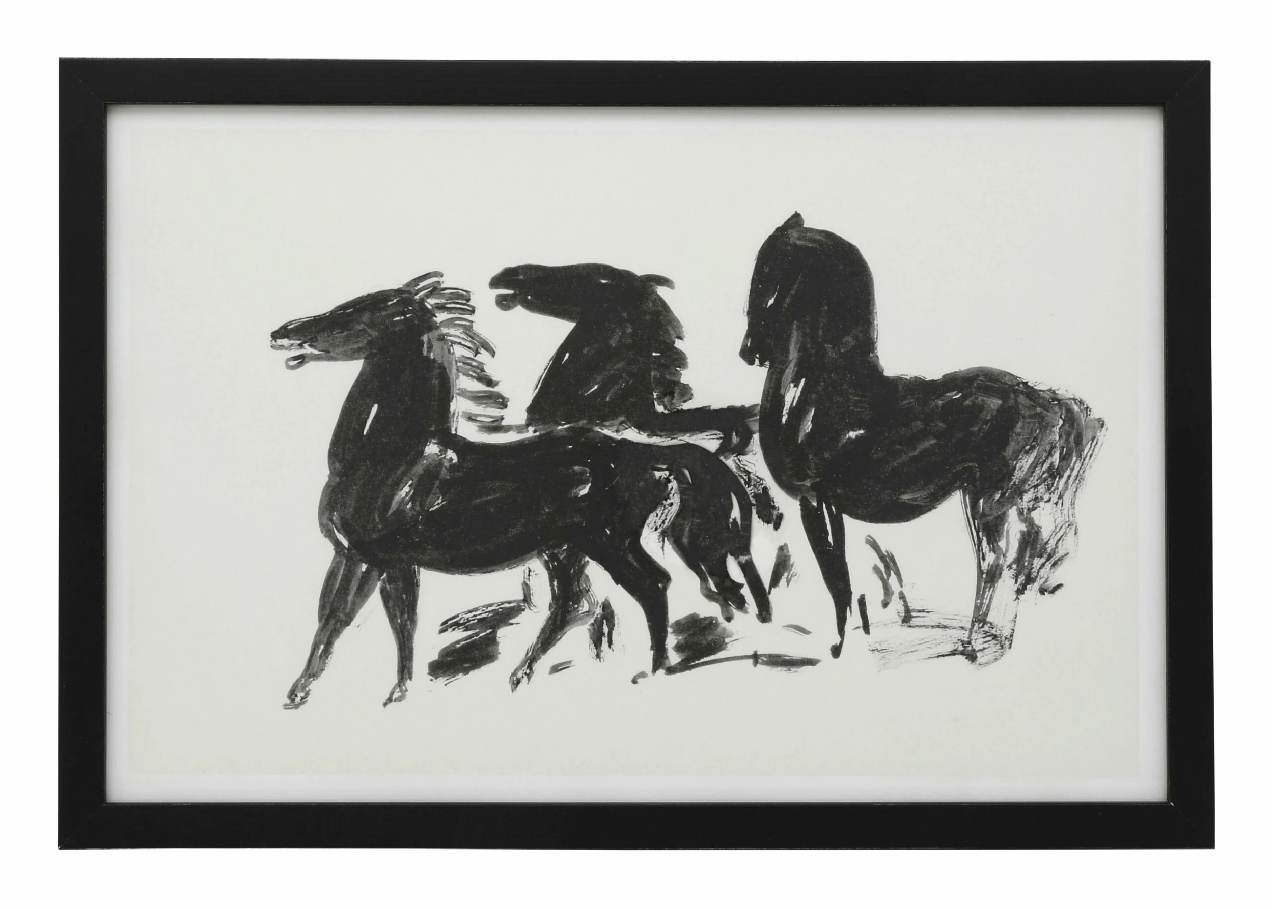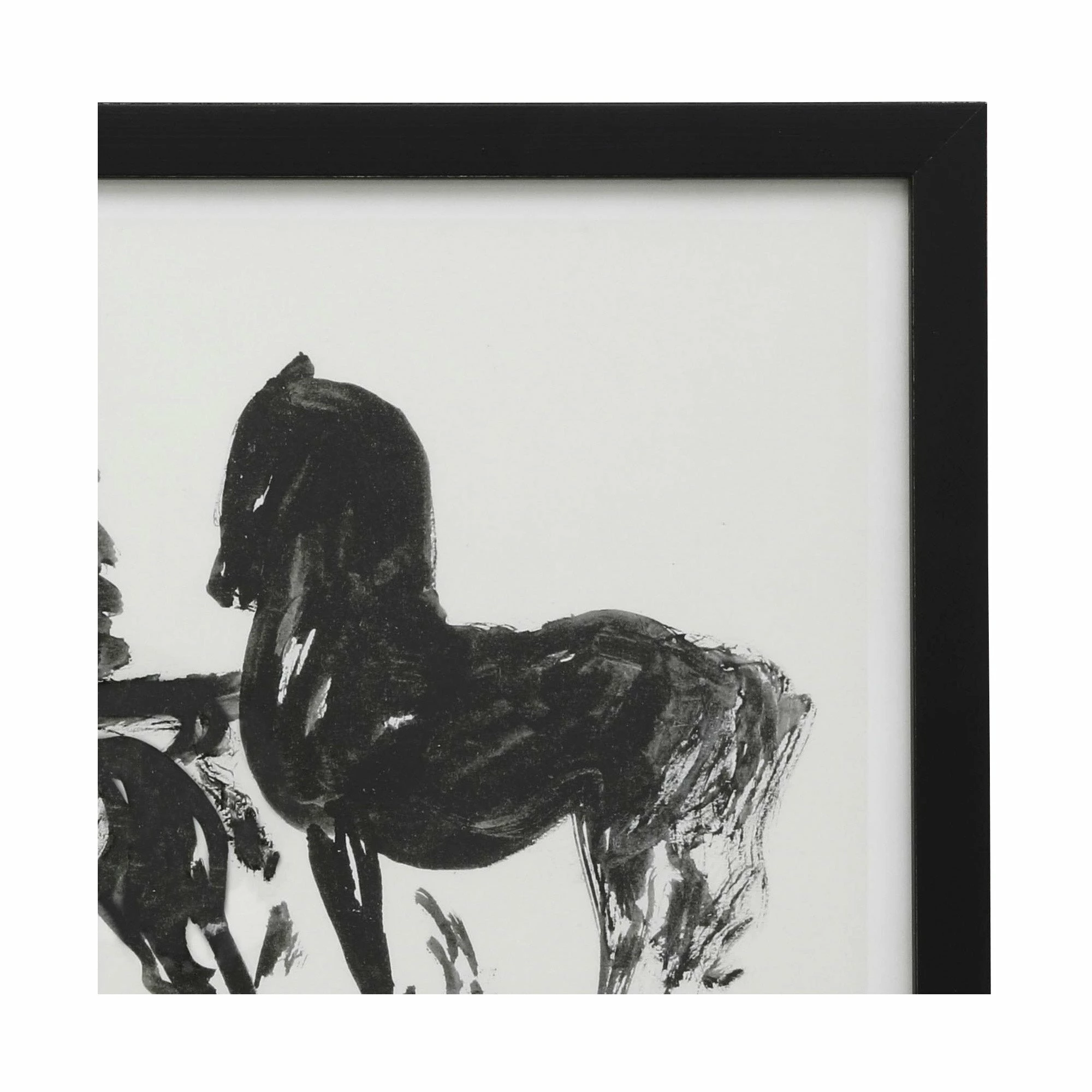 Bring a layer of history to your walls with our Trio of Horses Ink Drawing Print. Simple yet strong in composition, this piece captures three majestic mares using quick, gestural brushstrokes in a neutral black-and-white palette. Looking every bit the one-of-a-kind original, it’s actually a reproduction of an early 20th-century brush-and-ink illustration created by Dutch modernist painter Leo Gestel. We’ve displayed it in a sleek black wood frame, which keeps the viewer’s eye focused on the piece itself. Perfect for bringing an equestrian touch to any home’s art collection, we love our Trio of Horses Ink Drawing Print hung on its own or mixed in with our other vintage-inspired works for a gallery wall with a classic, collected feel.