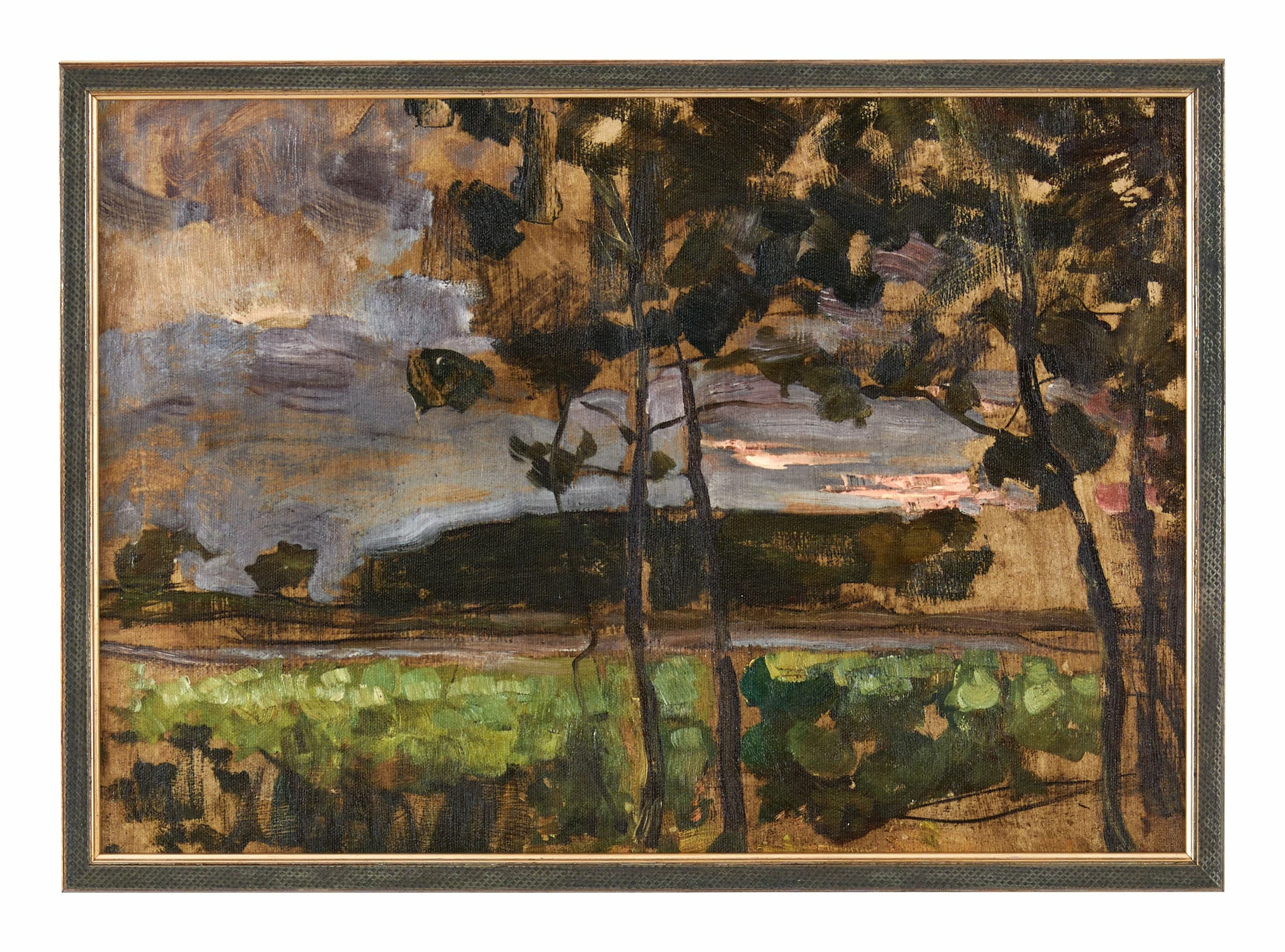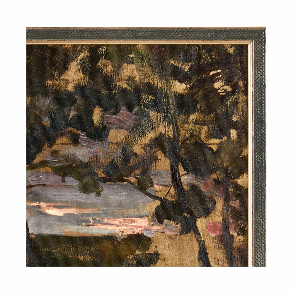 A tribute to the beauty of nature, our Waterside Study captures a tree-lined riverbank using an earth-toned palette and quick, heavy brushstrokes. A reproduction of an original landscape painting, this piece is printed on cotton canvas stretched over artist’s board and embellished with hand-applied details to give it all the feel of a one-of-a-kind original. We’ve displayed it without glass in an antiqued brass frame, which adds just the right amount of muted shine. With its small size and serene subject matter, our Waterside Study can hang all on its own but also looks lovely displayed alongside some of our other vintage-inspired works for a gallery wall with a classic feel.Â